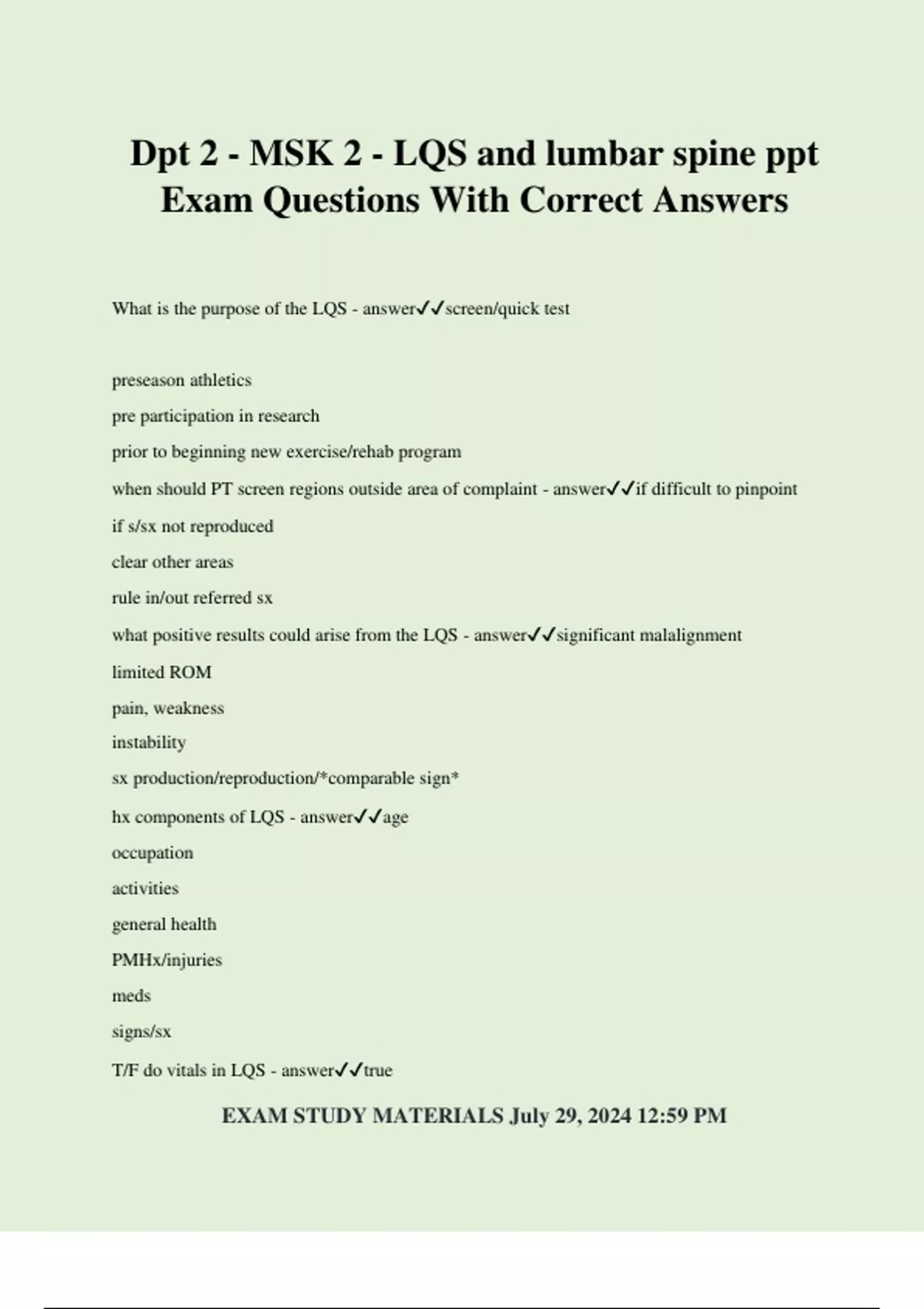Dpt 2 - MSK 2 - LQS and lumbar spine ppt Exam Questions With Correct Answers