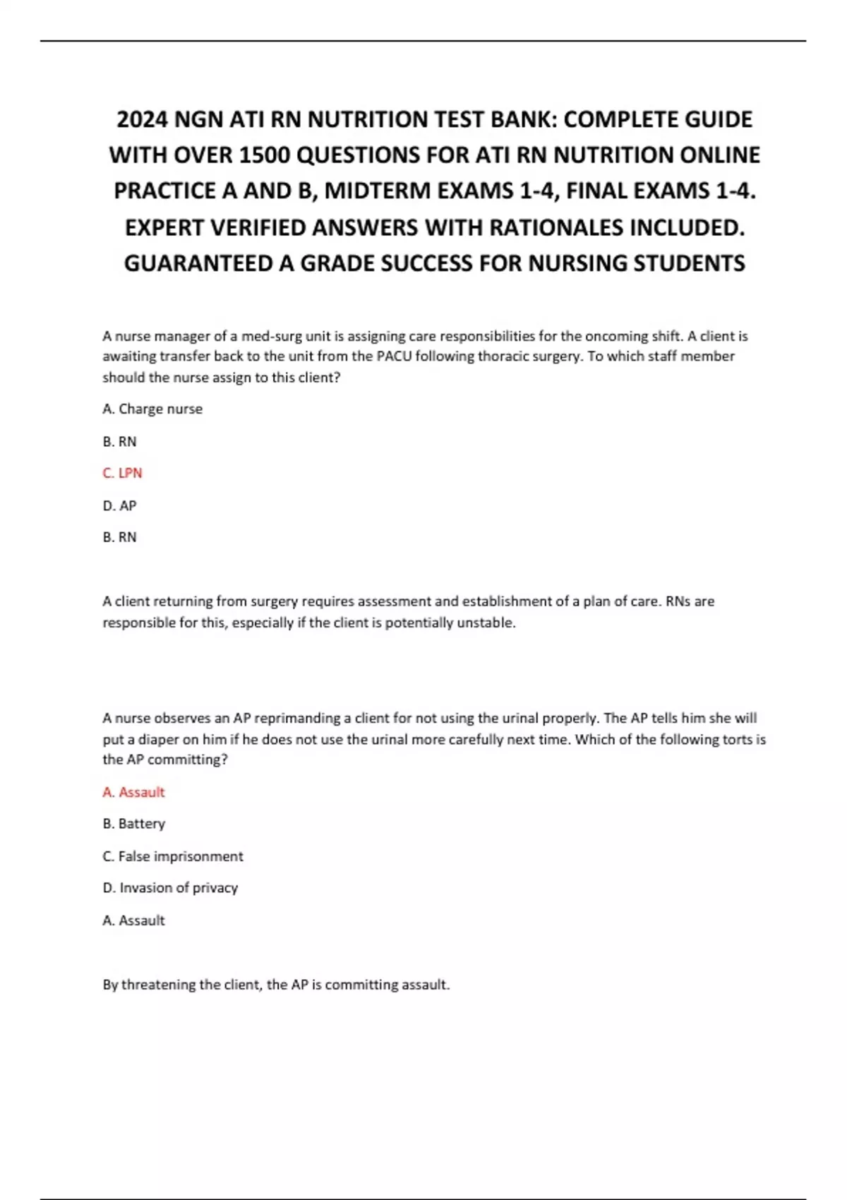 2024 NGN ATI RN NUTRITION TEST BANK: COMPLETE GUIDE WITH OVER 1500 QUESTIONS FOR ATI RN NUTRITION ONLINE PRACTICE A AND B, MIDTERM EXAMS 1-4, FINAL EXAMS 1-4. EXPERT VERIFIED ANSWERS WITH RATIONALES INCLUDED. GUARANTEED A GRADE SUCCESS FOR NURSING STUDENT