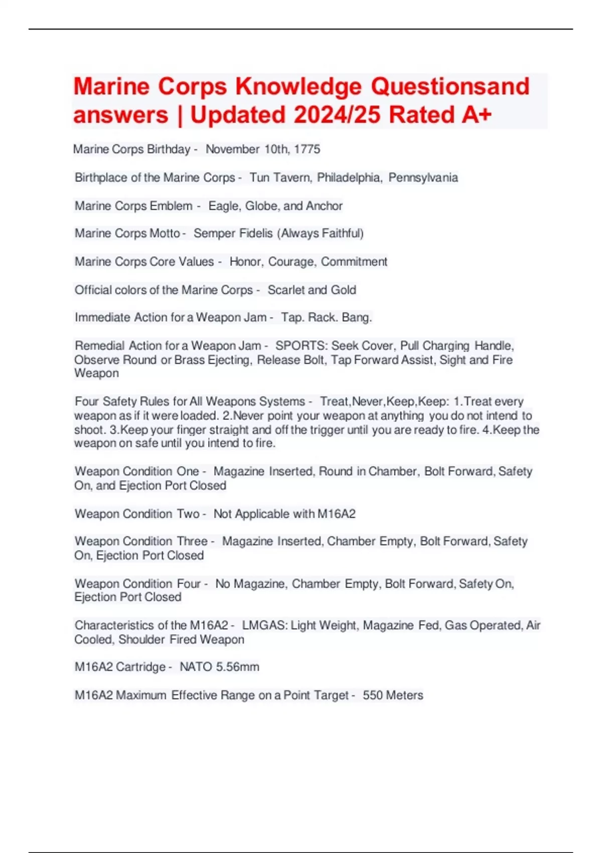 Exam (elaborations) Marine Corps Knowledge Questions and answers | With complete solution Updated 2024/25 2 Exam (elaborations) Marine Corps Knowledge Questions and answers | Latest 2024/25 RATED A+ 3 Exam (elaborations) Marine Corps Knowledge Questionsand answers | Updated 2024/25 Rated A+ 4 Exam (elaborations) MARINE CORPS STUDY GUIDE NEWEST W