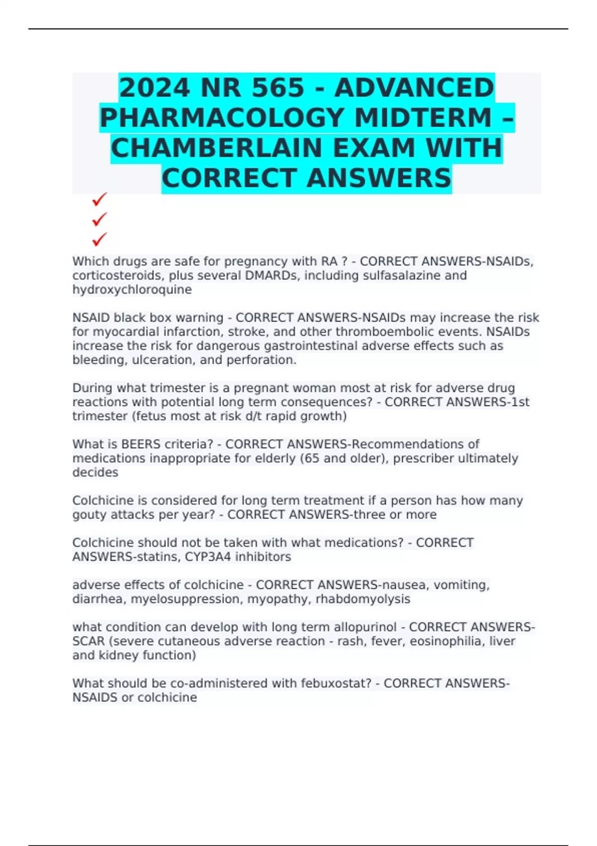 2024 NR 565 WEEK 2 STUDY QUESTIONS CHAPTERS 1, 4, 13, 25, AND 52 EXAM WITH CORRECT ANSWERS 2024 NR 565 WEEK 3 STUDY EXAM QUESTIONS CHAPTER 14 WITH CORRECT ANSWERS NR 565 - ADVANCED PHARMACOLOGY MIDTERM - CHAMBERLAIN MOCK PRACTICE 2024 2024 NR 565 - ADVANCED PHARMACOLOGY MIDTERM – CHAMBERLAIN EXAM WITH CORRECT ANSWERS 2024 NR 565 PHARM MIDTERM STUDY