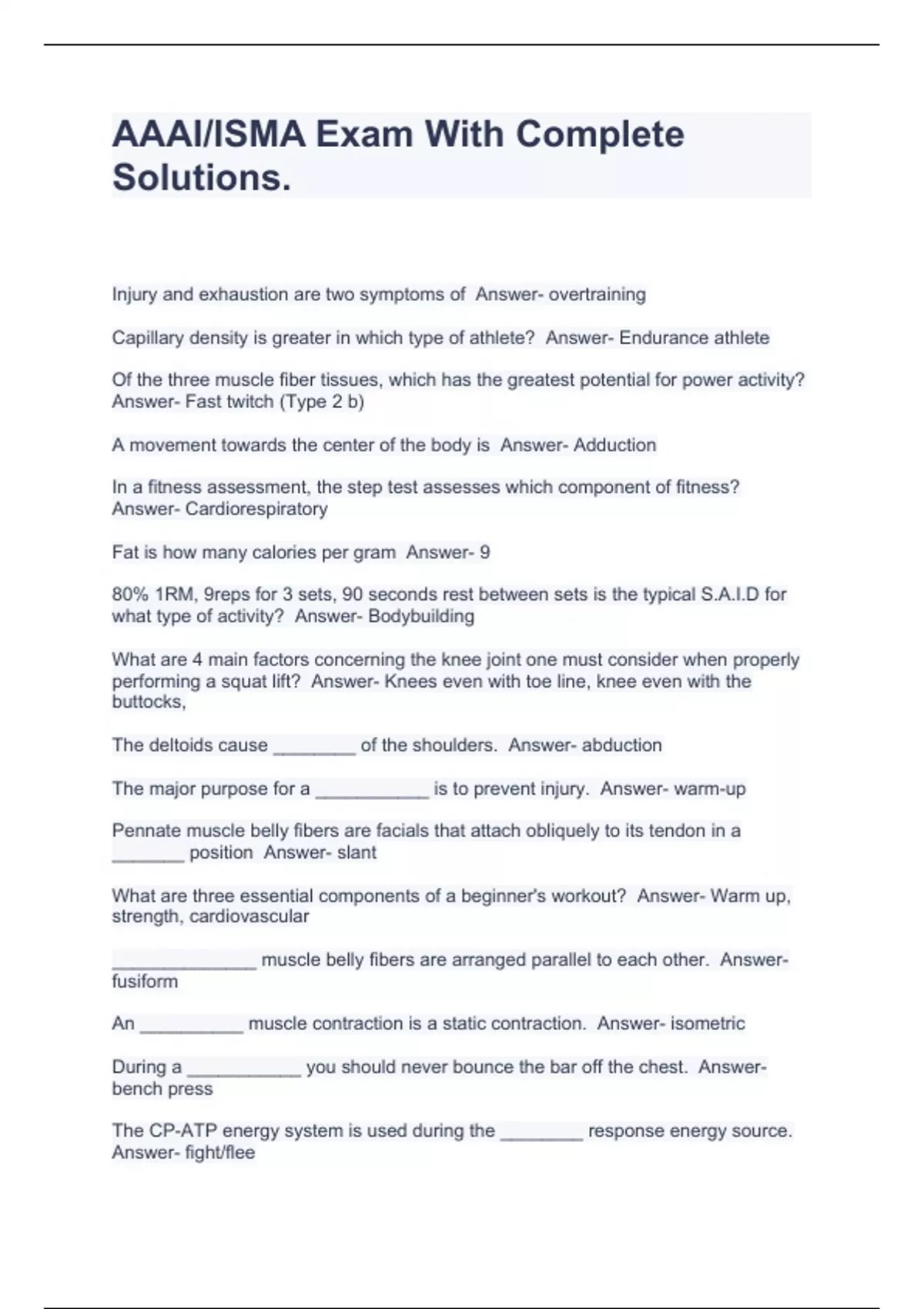 AAAI-ISMA PERSONAL TRAINER CERTIFICATION 2024 EXAM WITH COMPLETE SOLUTIONS!!,AAAI-ISMA PRACTICE TEST QUESTIONS & ANSWERS VERIFIED 100% CORRECT!!,AAAI/ISMA EXAM REVIEW SHEET REVISED 2024 QUESTIONS & ANSWERS RATED 100% CORRECT!!,AAAI/ISMA Exam With Complete Solutions.,AAAI/ISMA PERSONAL TRAINER CERTIFICATION WORKSHOP STUDY/REVIEW SOLVED & RATED 100%