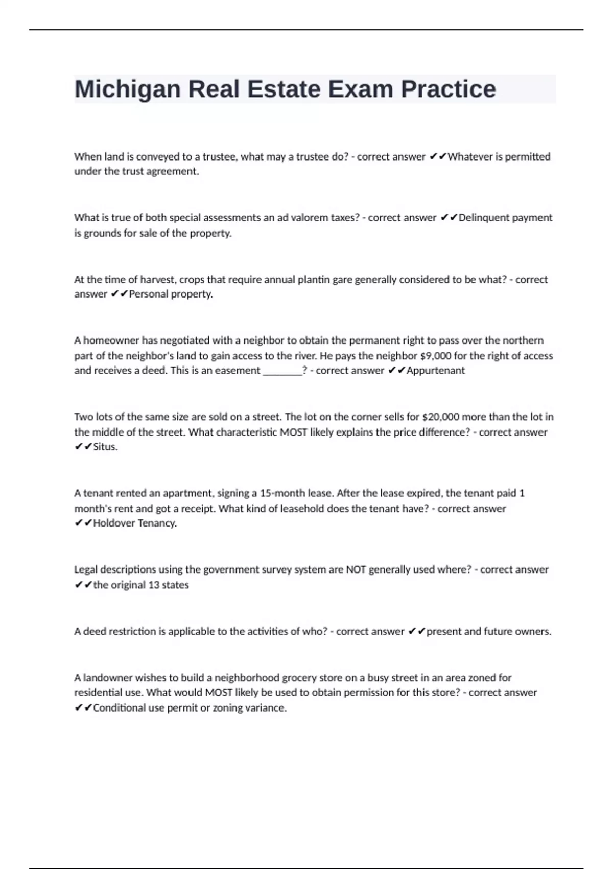 1 Exam (elaborations) OCAB REAL ESTATE PRACTICE well answered to pass 2 Exam (elaborations) real estate terminology Michigan with complete solutions 3 Exam (elaborations) Michigan Real Estate Salesperson Exam 2017 updated already passed 4 Exam (elaborations) Michigan Salesperson s Exam questions with complete solutions graded A+