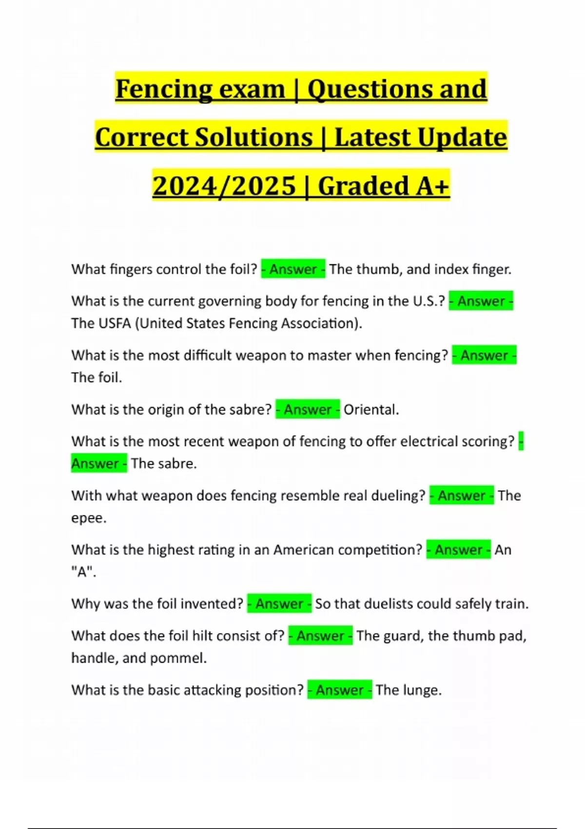 Bundle for Referee Fencing Exams | Questions and Correct Answers | Latest Update 2024/2025 | Graded A+