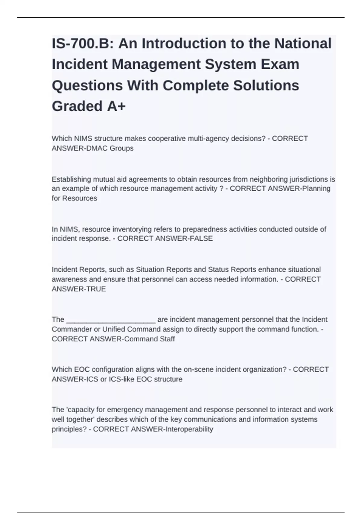 IS-700: An Introduction to the National Incident Management System Exam Questions & Answers Rated A+ Real Exam!!