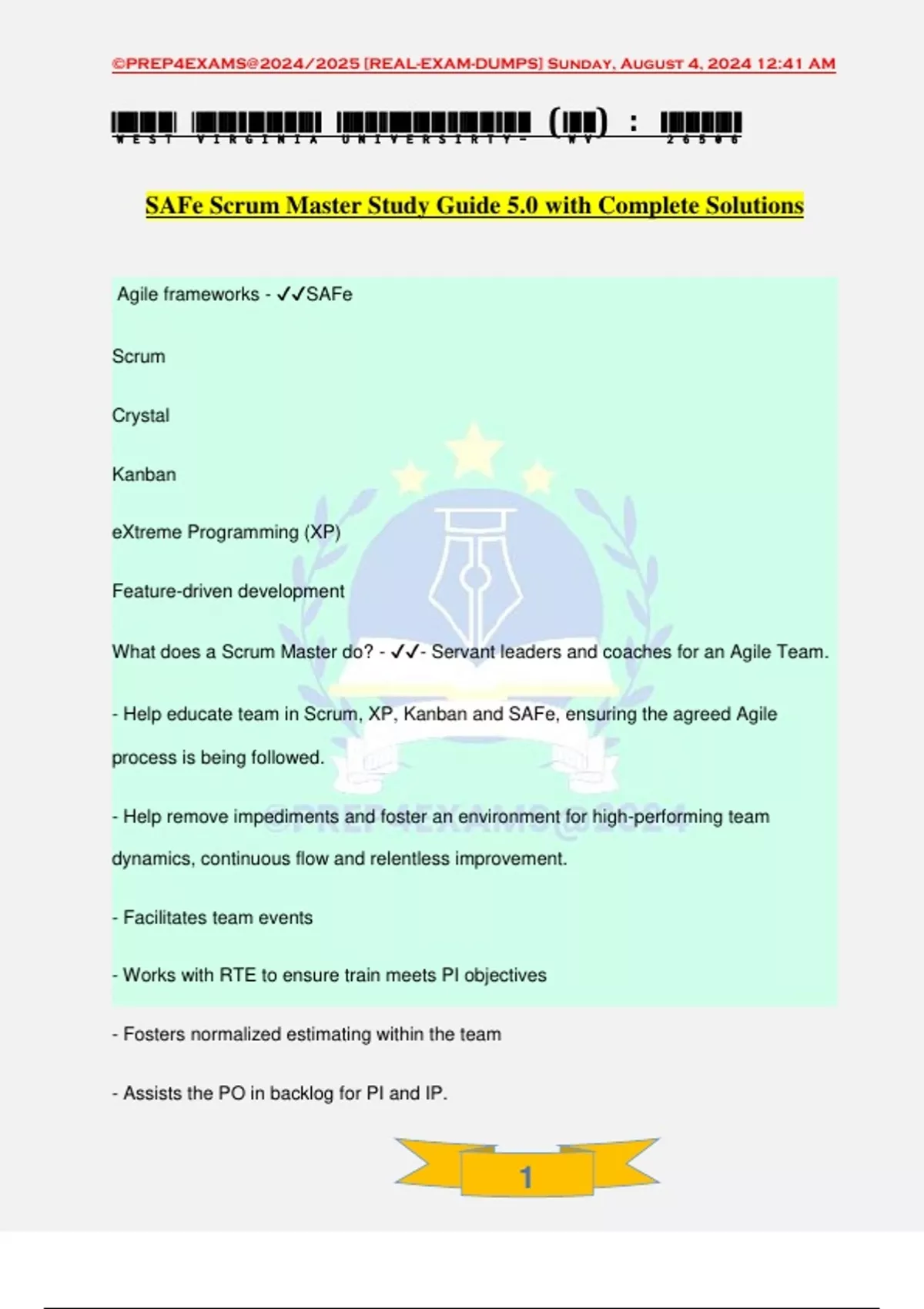 SAFe Scrum Master Study Guide 5.0 with Complete Solutions