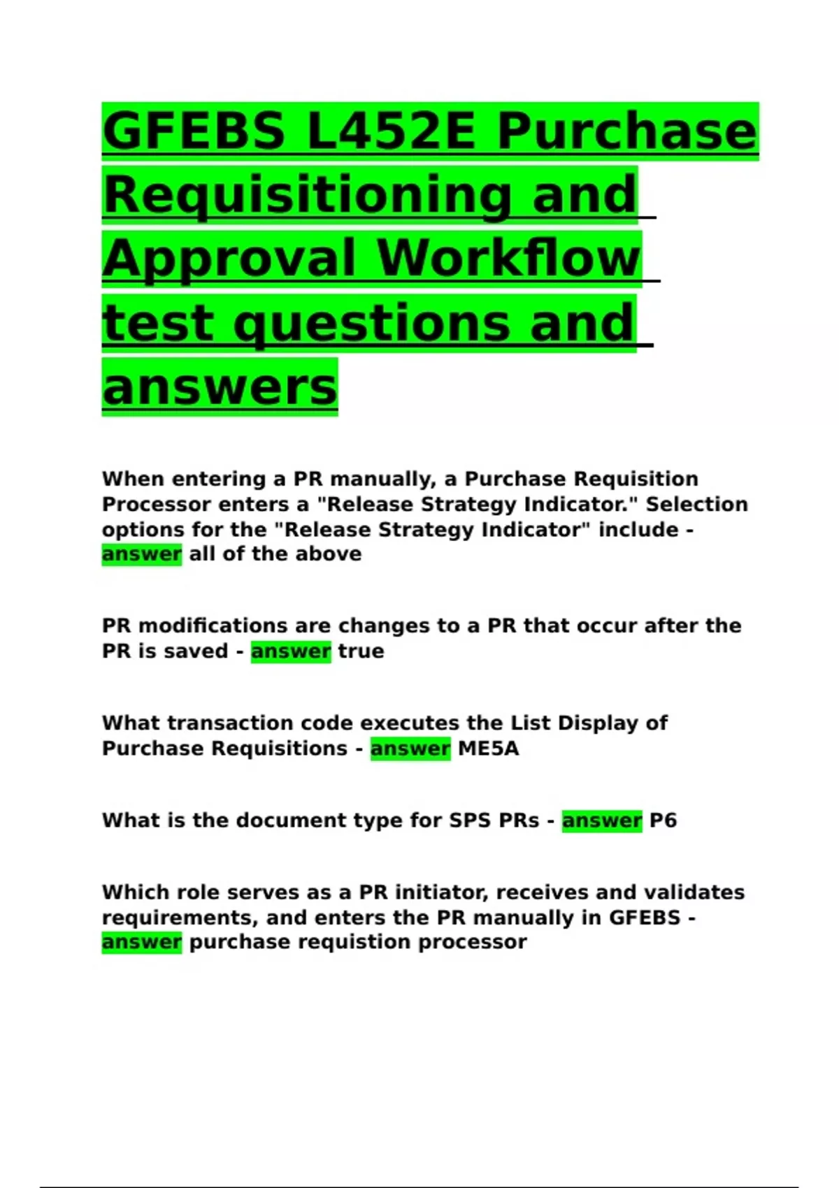 GFEBS L452E Purchase Requisitioning and Approval Workflow test questions and answers.