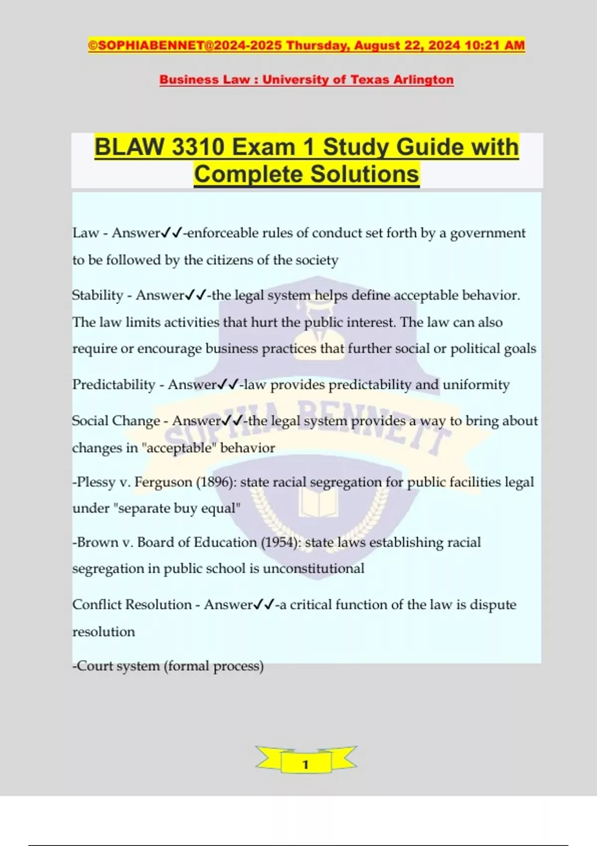 BLAW 3310 Exam 1 Study Guide with Complete Solutions