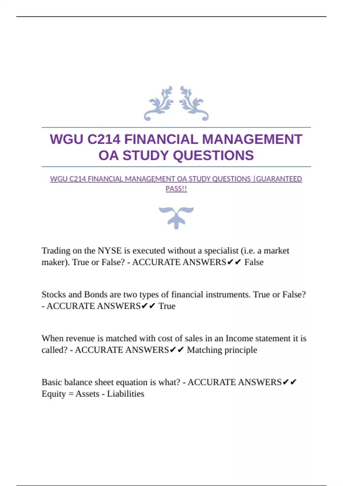 WGU C214 FINANCE MANAGEMENT (PVCC) EXAM |GUARANTEED PASS |UPDATED WGU C214 FINANCE MANAGEMENT PVCC TEST QUESTIONS WITH GUARANTEED ACCURATE ANSWERS WGU C214 FINANCIAL MANAGEMENT EXAM WITH GUARANTEED ACCURATE ANSWERS |VERIFIED WGU-C214 FINANCIAL MANAGEMENT FINAL EXAM WITH GUARANTEED ACCURATE ANSWERS |VERIFIED WGU C214 OA FINANCIAL MANAGEMENT EXAM WIT