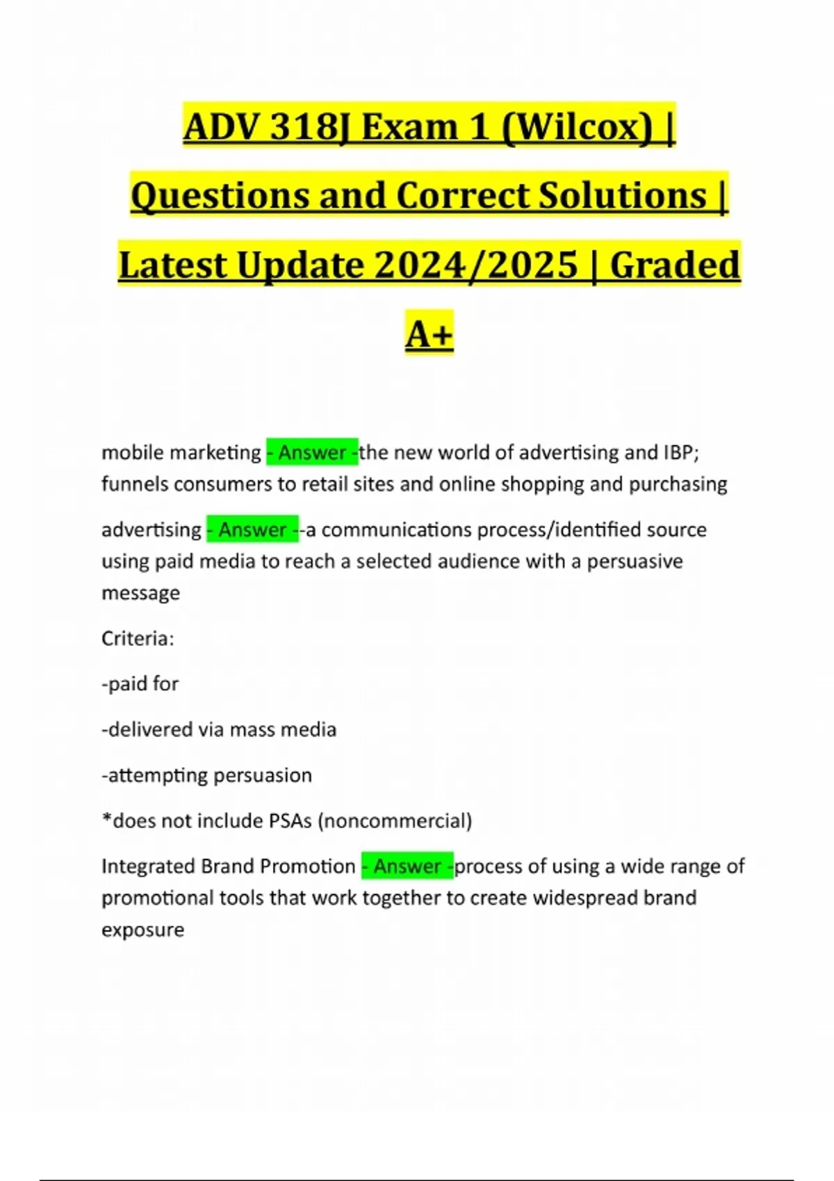 ADV (ADVERTISING) 318J WILCOX EXAMS | PACKAGE DEAL | QUESTIONS AND ANSWERS | 2024/2025 Updated. Actual tests, wilcox exams, chapters, textbook,