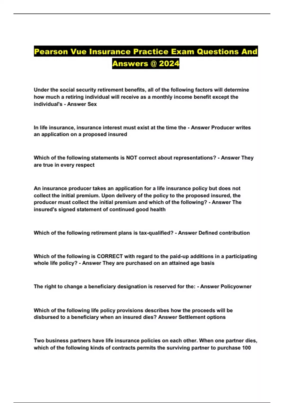 Pearson Vue Insurance Study Exam Questions And Answers