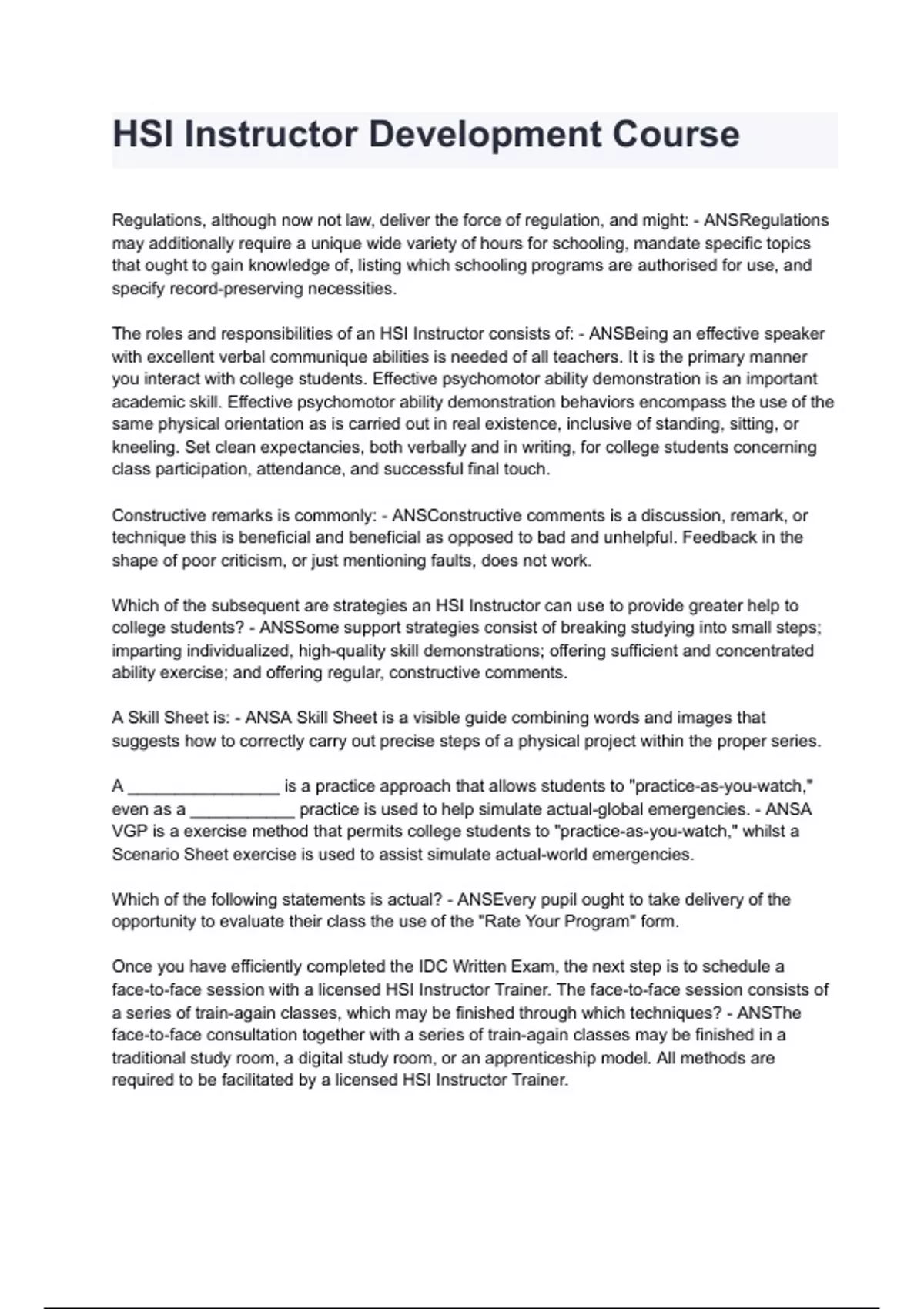 HSI Instructor Development Course Exam 2024/2025 Questions and Answers (ALL BUNDLED HERE!!!)