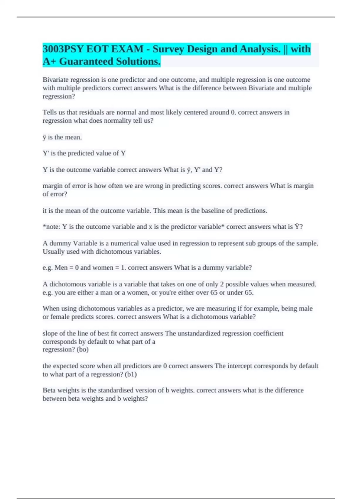 3003PSY Survey Design and Analysis Module Content - Mid-Trimester Exam || with 100% Error-free Answers. 3003PSY - Week 3 || A+ Guaranteed. 3003PSY EOT EXAM - Survey Design and Analysis. || with A+ Guaranteed Solutions. 3003PSY Final || with A+ Guaranteed Solutions. 3003PSY mid tri exam || with 100% Error-free Solutions. 3003PSY Survey Design and An
