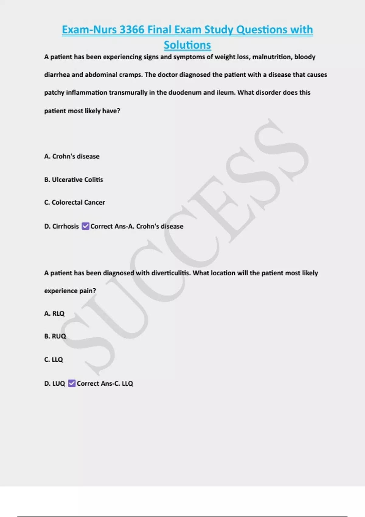 Exam-Nurs 3366 Final Exam Study Questions with Solutions 2 Exam (elaborations) Exam-NURS 3366- Pathophysiology Test 2; Questions and Answers 3 Exam (elaborations) Exam 2-NURS 3366; Questions and Answers 100% Solved 4 Exam (elaborations) Exam 3-Nurs 3366:Patho; Questions and Answers 100% Solved