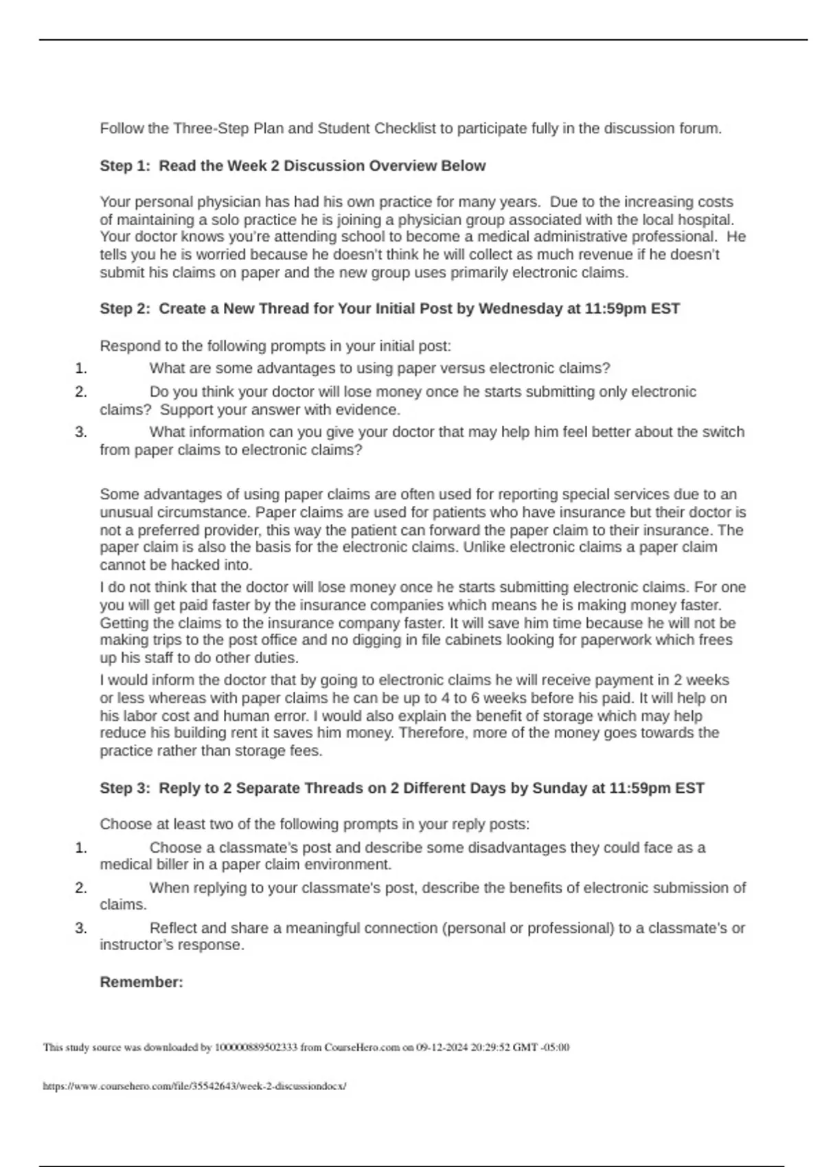 (ME2550) Healthcare Settings, Claim Cycle, and Claims Processing ME2550-Week 2 Discussion, Paper vs. Electronic claims