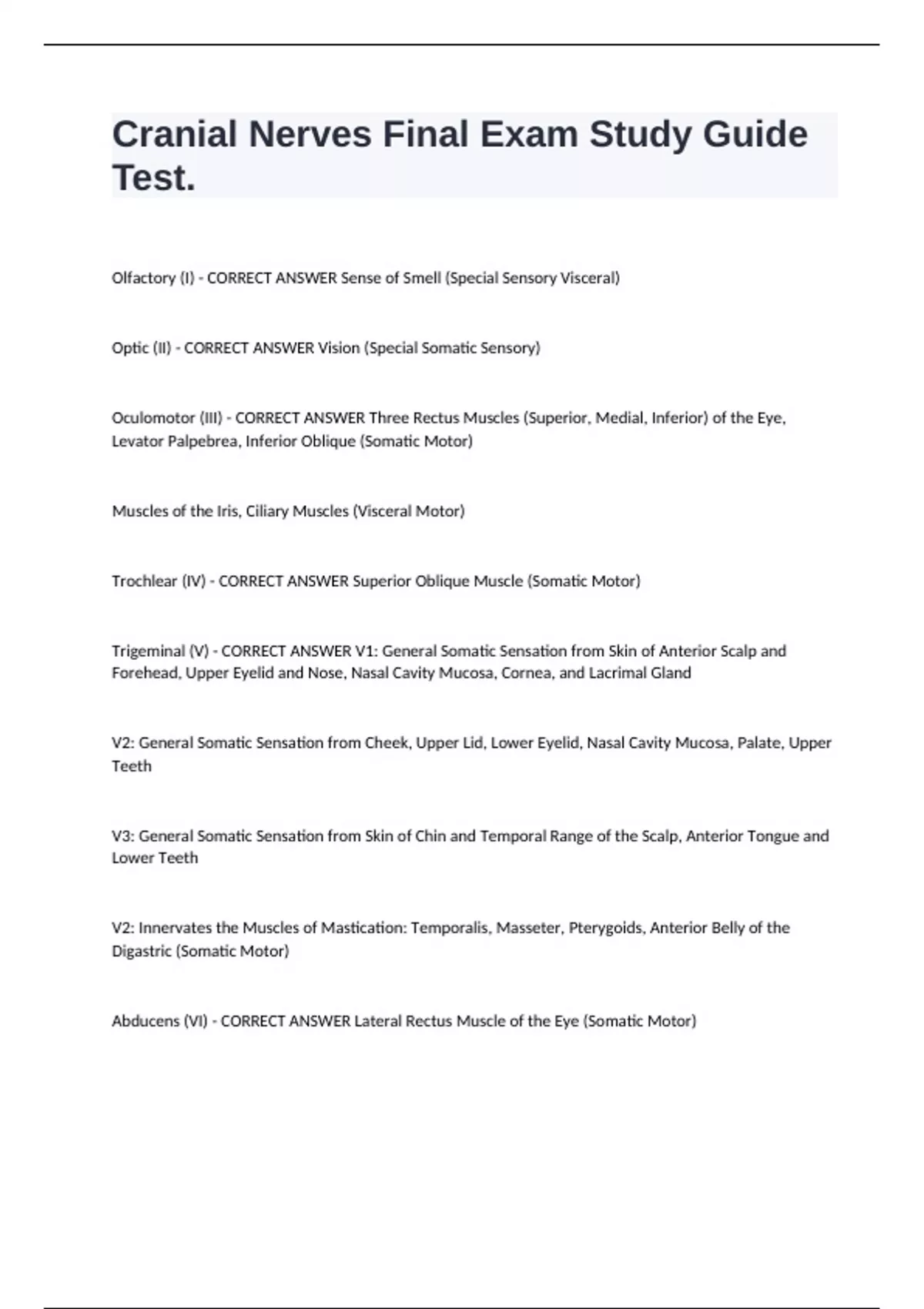 Exam (elaborations) Cranial Nerve Written Exam Questions. Exam (elaborations) Cranial Nerves Complete Study Exams With Complete Solutions. Exam (elaborations) Cranial Nerves Exam Questions Correctly Answered. Exam (elaborations) Cranial Nerves Final Exam. Exam (elaborations) Cranial Nerves Advanced Exam Questions & Answers. Exam (elabora