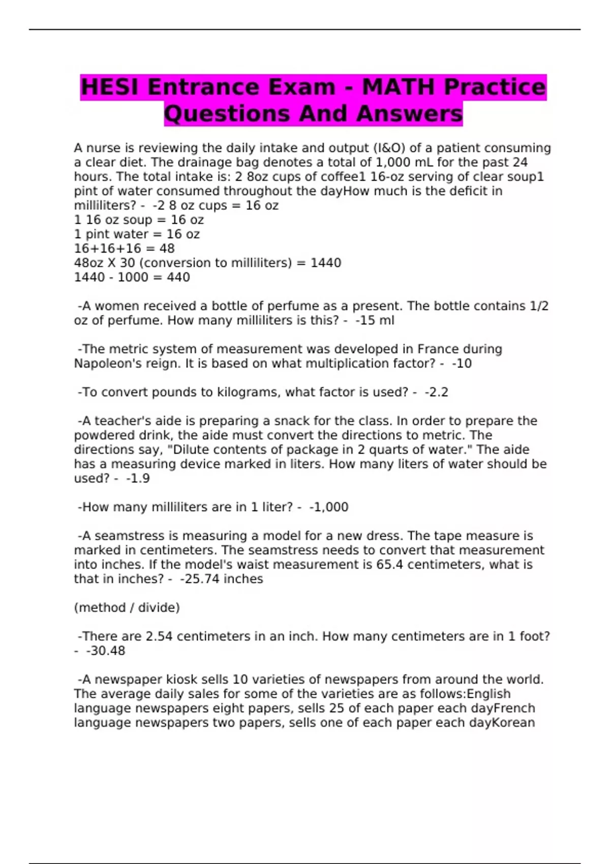 HESI Entrance Exam - MATH Practice Questions And Answers