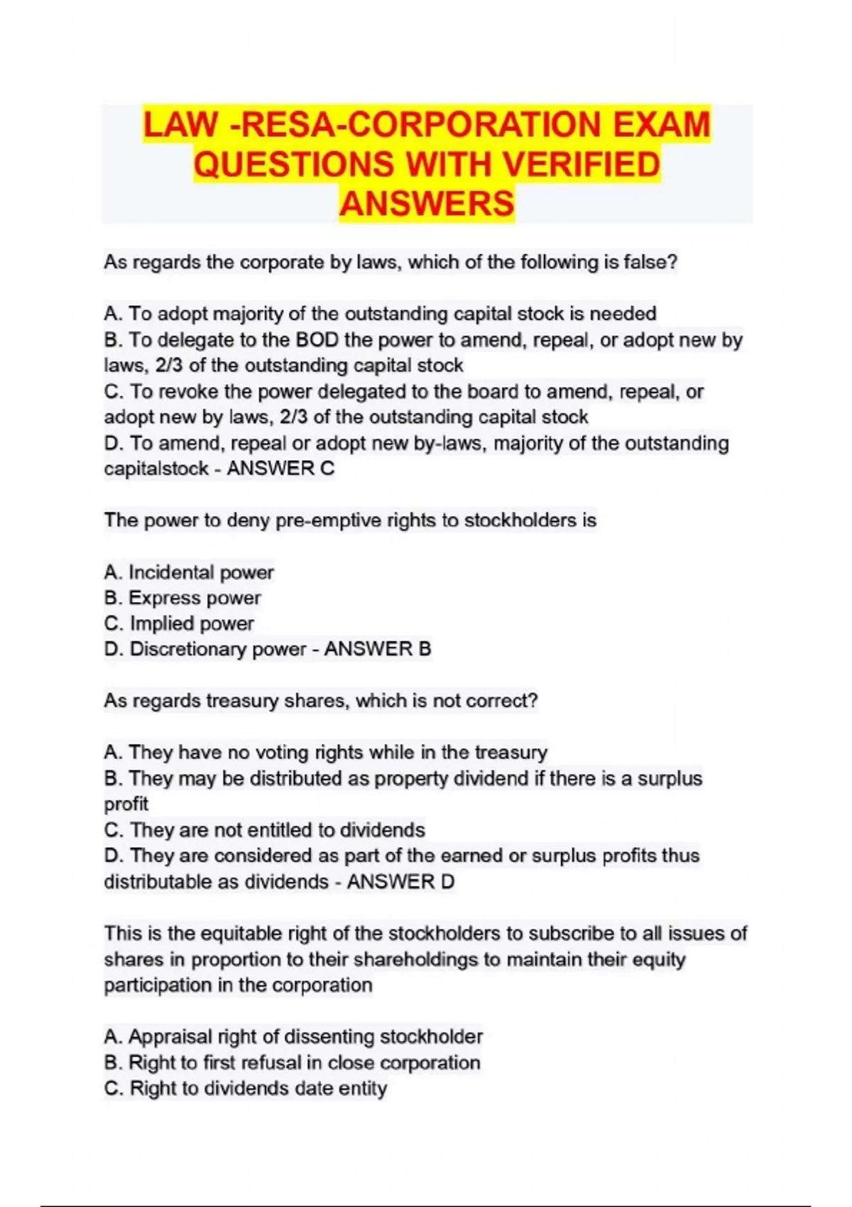 LAW -RESA-CORPORATION EXAM QUESTIONS WITH VERIFIED ANSWERS