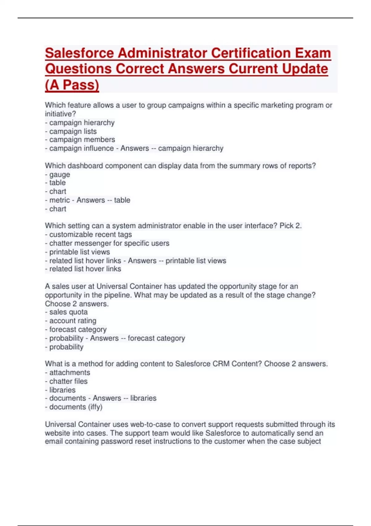 1 Exam (elaborations) Salesforce.com Administrator Certification Exam Answers New Update (A+ Pass) 2 Exam (elaborations) Salesforce Administrator Certification Exam Answers New Update (Verified Pass) 3 Exam (elaborations) Salesforce Administrator Certification Exam Questions Complete Answers (Verified A Pass) 4 Exam (elaborations) Salesforce Adm