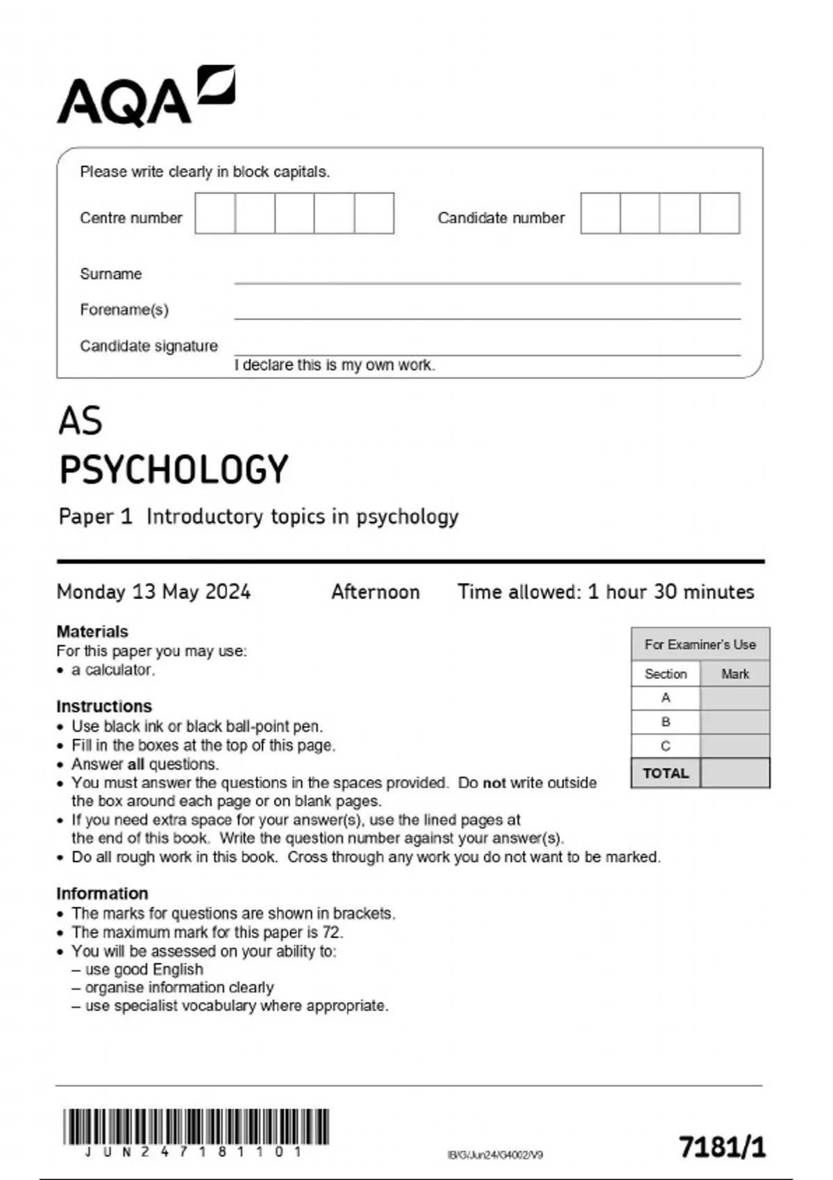 AQA AS PSYCHOLOGY Paper 1 Introductory topics in psychology 7181/1-QP-Psychology-AS-13May24