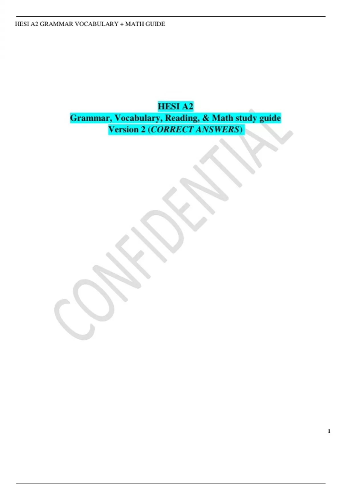 HESI A2 Grammar, Vocabulary, Reading, & Math study guide Version 2 (CORRECT ANSWERS)