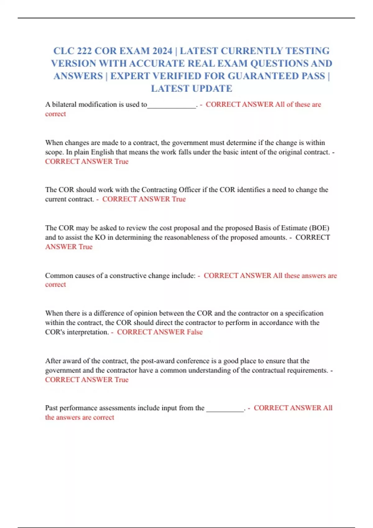 CLC 222 CONTRACTING OFFICER REPRESENTATIVE (COR) CERTIFICATION EXAM 2024/2025 | ACCURATE REAL EXAM QUESTIONS WITH ANSWERS AND RATIONALES WITH A STUDY GUIDE | EXPERT VERIFIED FOR GUARANTEED PASS