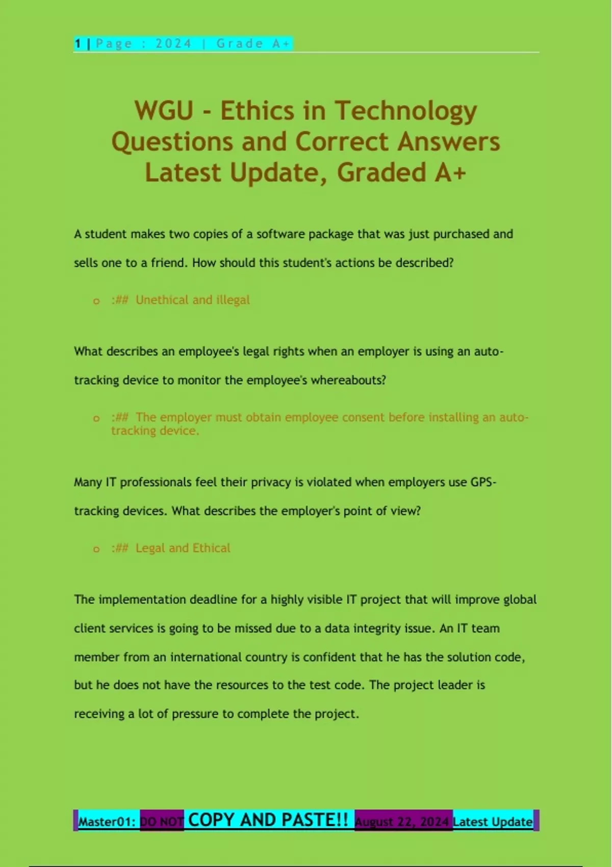 WGU - Ethics in Technology Questions and Correct Answers Latest Update, Graded A+