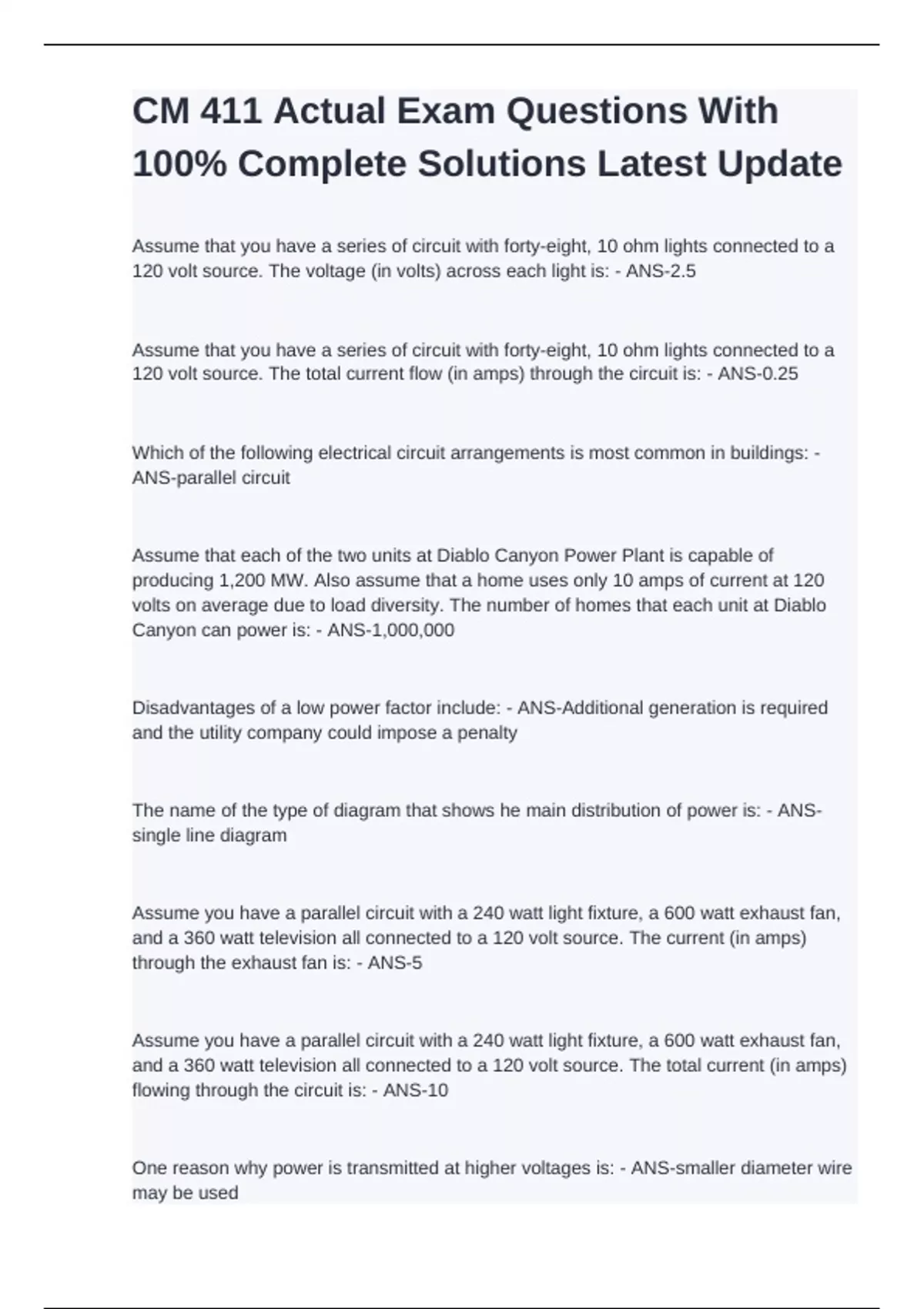 CM 411 - Electrical Actual Exam Questions With 100% Accurate Solutions Rated A+
