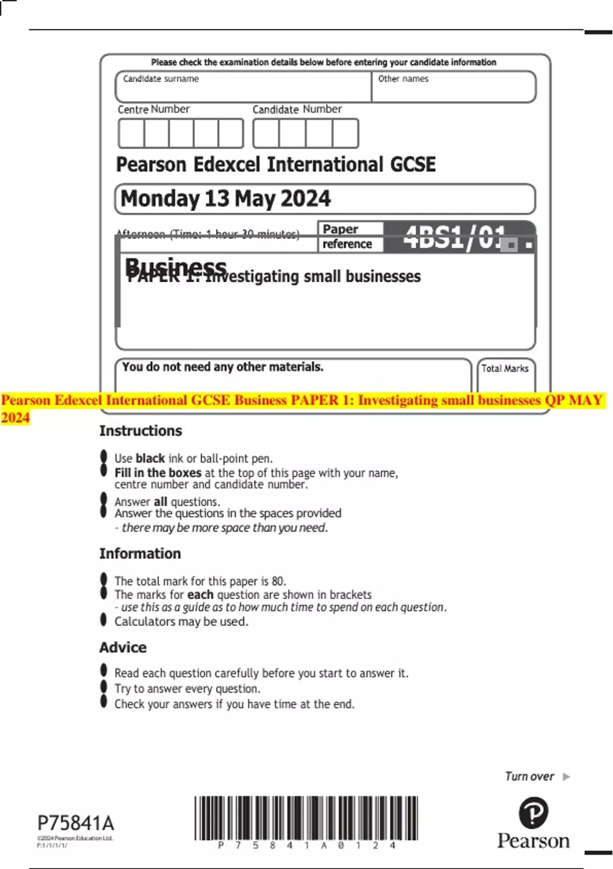 Pearson Edexcel International GCSE 4BS1/01R Business PAPER 1: Investigating small businesses QP MAY 2024