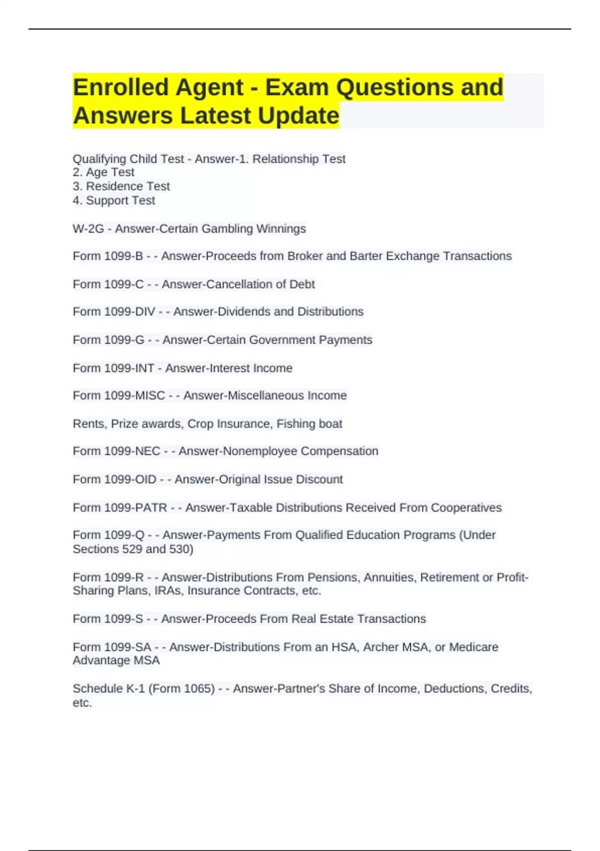 Exam (elaborations) Enrolled Agent - Exam Questions and Answers Latest Update Exam (elaborations) Enrolled Agent - INDIVIDUALS Exam Questions with Latest Update Exam (elaborations) Enrolled Agent - Part 1 Section 1 Exam Questions with Correct Answers Exam (elaborations) Enrolled Agent - Tax Forms (Gleim Prep Course) Exam Questions