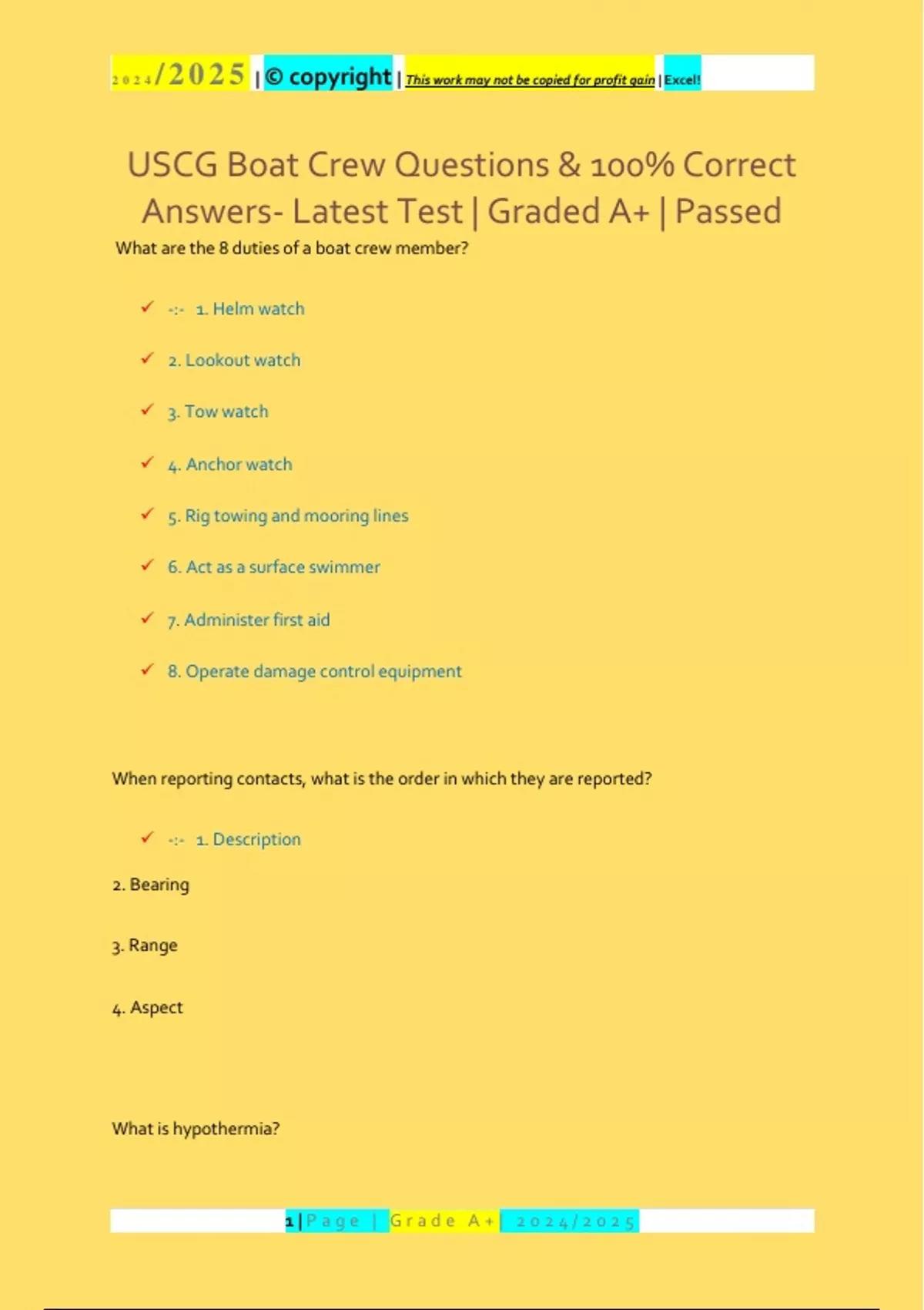 USCG Boat Crew Member Training Study Guide Questions & 100% Correct AnswersLatest Test | Graded A+ | Passe