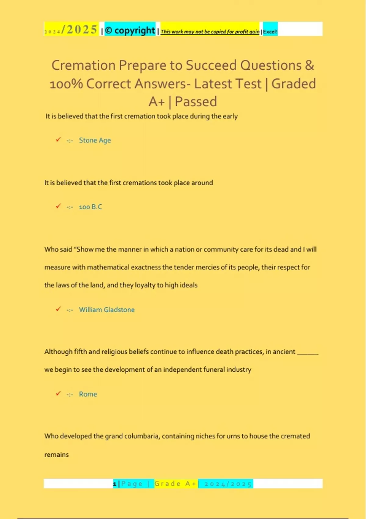 Cremation Questions & 100% Correct Answers- Latest Test | Graded A | Passed