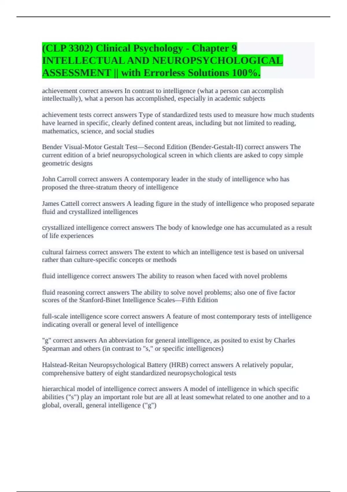 (CLP 3302) Clinical Psychology - Chapter 10 Personality Assessment and Behavioral Assessment || Already Passed. Test 2- CLP 3302 || with Error-free Solutions. CLP 3302) CLINICAL PSYCHOLOGY-CHAPTER -15-COGNITIVE PSYCHOTHERAPY AND MINDFULNESS-BASED THERAPIES || ALL CORRECT. CLP 3302) Clinical Psychology-Chapter -14-BEHAVIOR THERAPY || Already Passed.