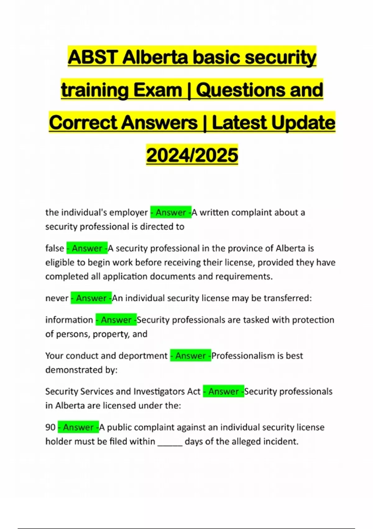 ABST (ALBERTA BASIC SECURITY TRAINING) BUNDLED EXAMS:::: QUESTIONS ADN CORRECT ANSWERS | LATEST UPDATE 2024/2025