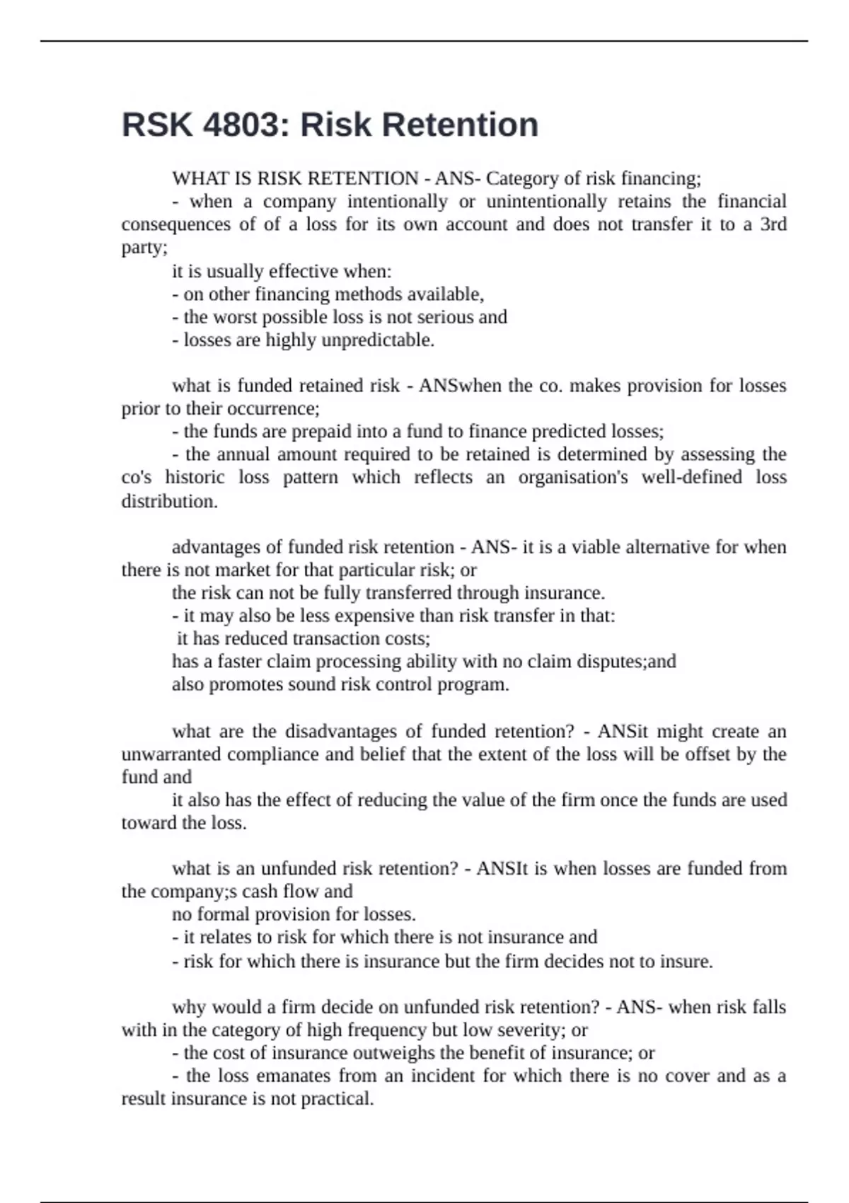 The documents contains correct questions and well elaborated answers. Terms used in risk management with their correct meaning. Risk management is the process of identifying, assessing and controlling financial, legal, strategic and security risks to an organization's capital and earnings.