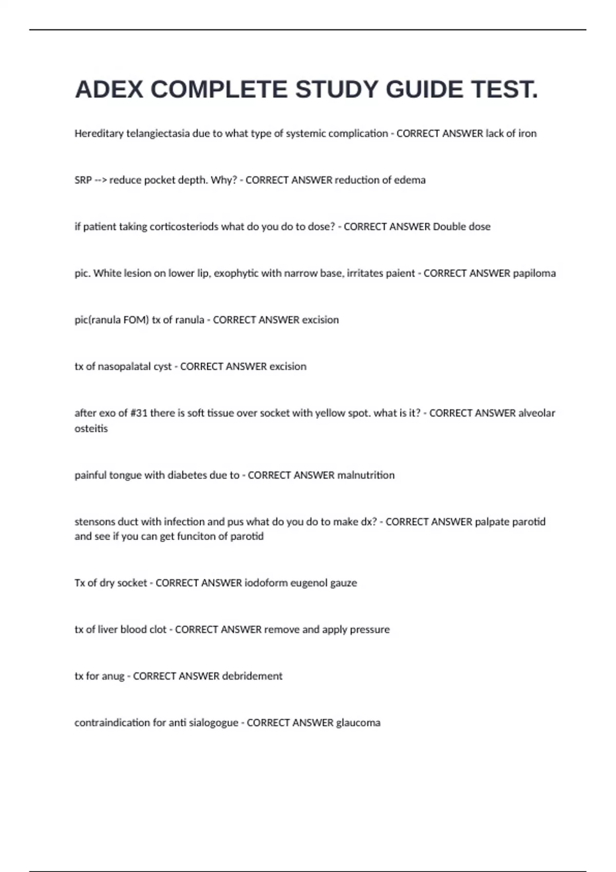 Exam (elaborations) CDCA OSCE COMPLETE EXAM QUESTIONS WITH 100 CORRECT ANSWERS. Exam (elaborations) ADEX Medicine Review Practice Exam Questions & Answers. Exam (elaborations) ADEX Rest Study Exam Questions & Answers. Exam (elaborations) Mango ADEX OSCE – 2024 Study Guide Test. Exam (elaborations) DSE OSCE – STUDY GUIDE TEST.