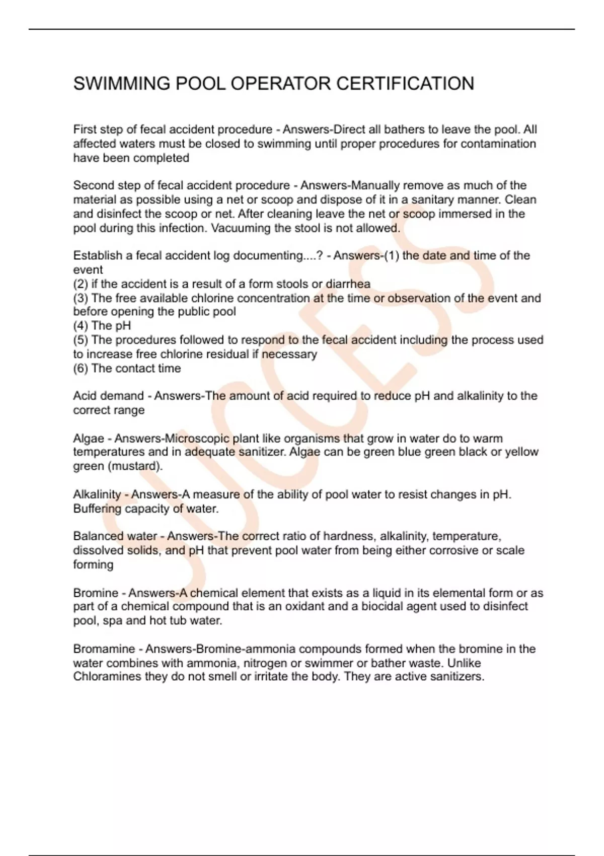 AQUATIC FACILITY OPERATOR QUESTIONS AND ANSWERS 2 Exam (elaborations) SWIMMING POOL OPERATOR CERTIFICATION 3 Exam (elaborations) POOL OPERATORS TEST QUESTIONS WITH ANSWERS 4 Exam (elaborations) POOL OPERATORS TEST QUESTIONS AND ANSWERS 5 Exam (elaborations) POOL OPERATOR QUESTIONS AND ANSWERS 6 Exam (elaborations) POOL QUESTIONS AND ANSWERS 7