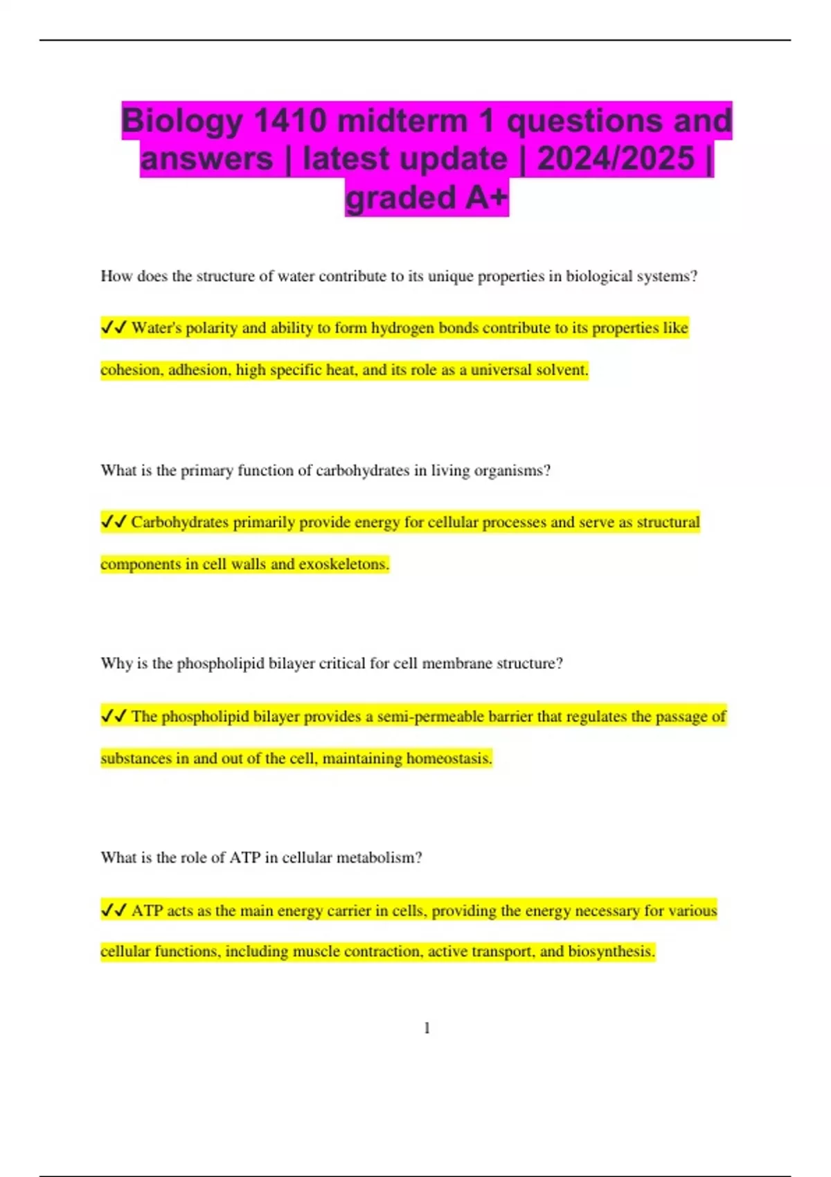 BIOL 1410 Bundled Exams Questions and Answers Latest Versions (2024/2025) (Complete and Accurate)