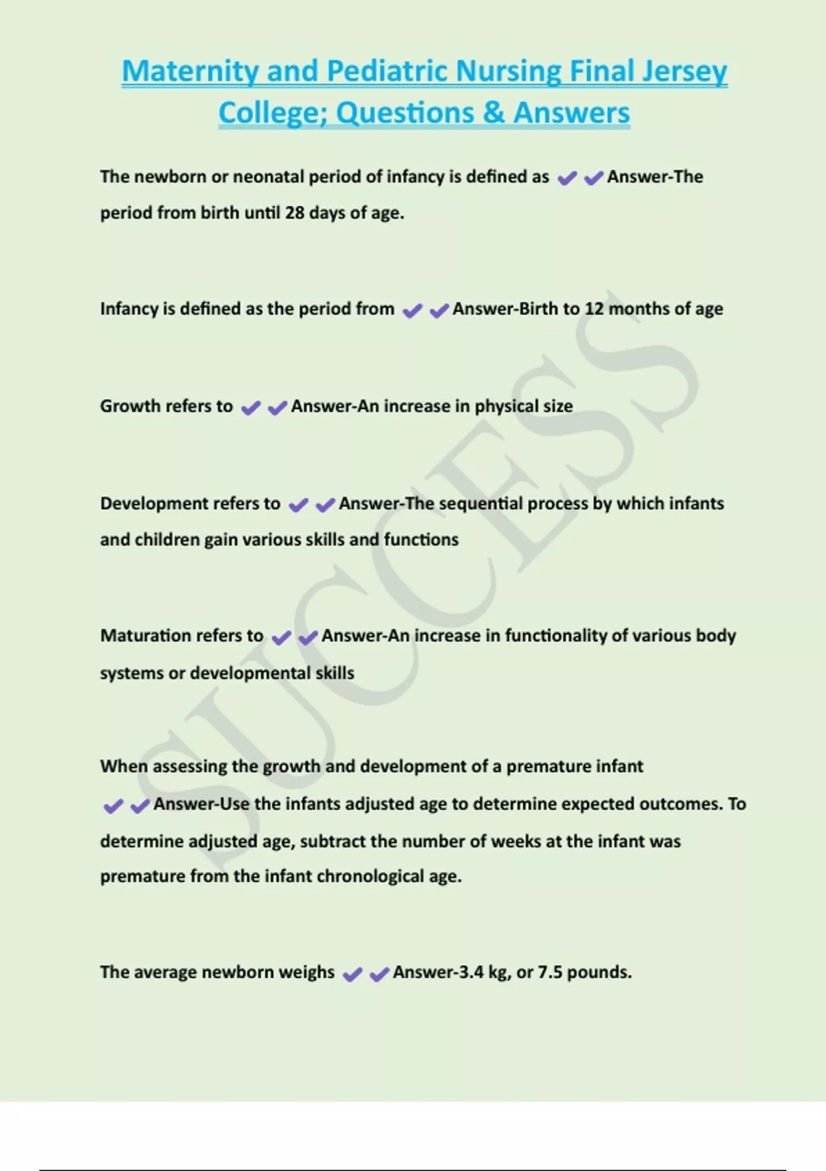 Maternity and Pediatric Nursing Final Jersey College; Questions & Answers