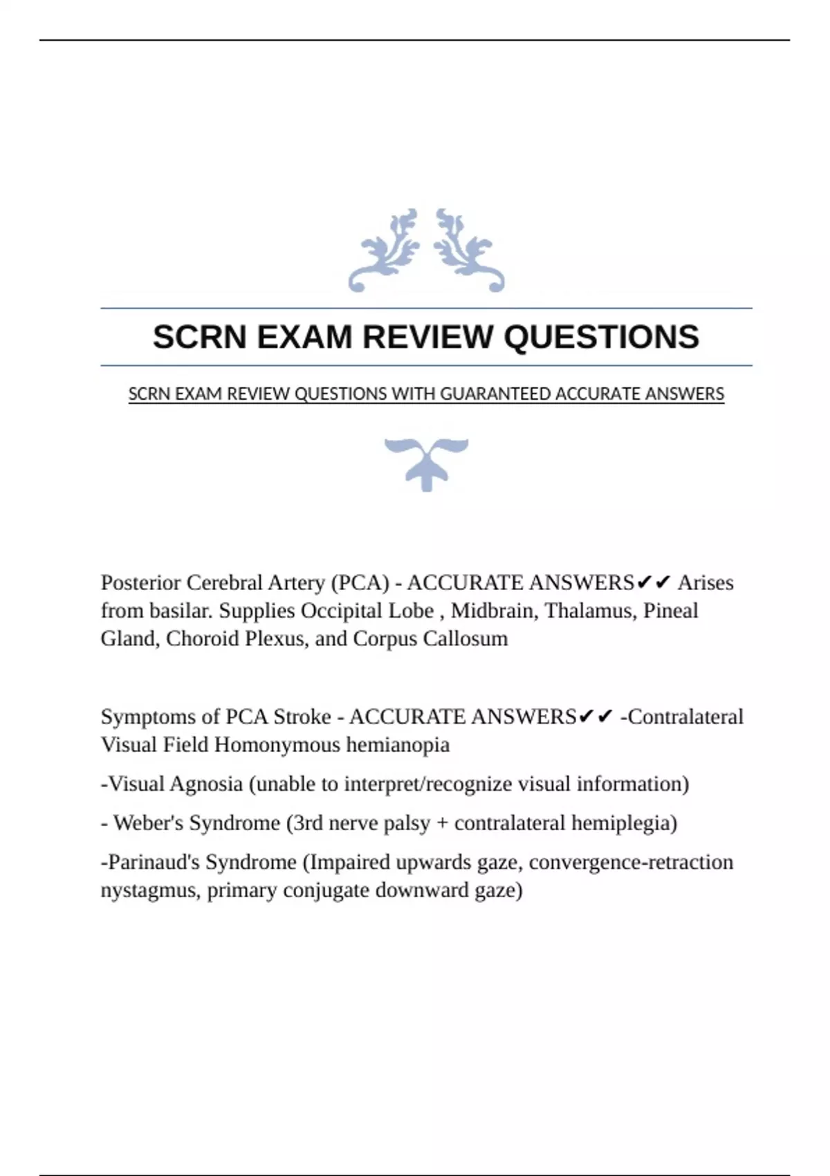 SCRN EXAM QUESTIONS 2024|2025 WITH GUARANTEED ACCURATE ANSWERS SCRN EXAM REVIEW QUESTIONS WITH GUARANTEED ACCURATE ANSWERS SCRN PRACTICE EXAM QUESTIONS WITH GUARANTEED ACCURATE ANSWERS |VERIFIED SCRN TEST QUESTIONS WITH GUARANTEED ACCURATE ANSWERS SCRN STUDY QUESTIONS {STROKE NURSING 2ND ED} WITH GUARANTEED ACCURATE ANSWERS