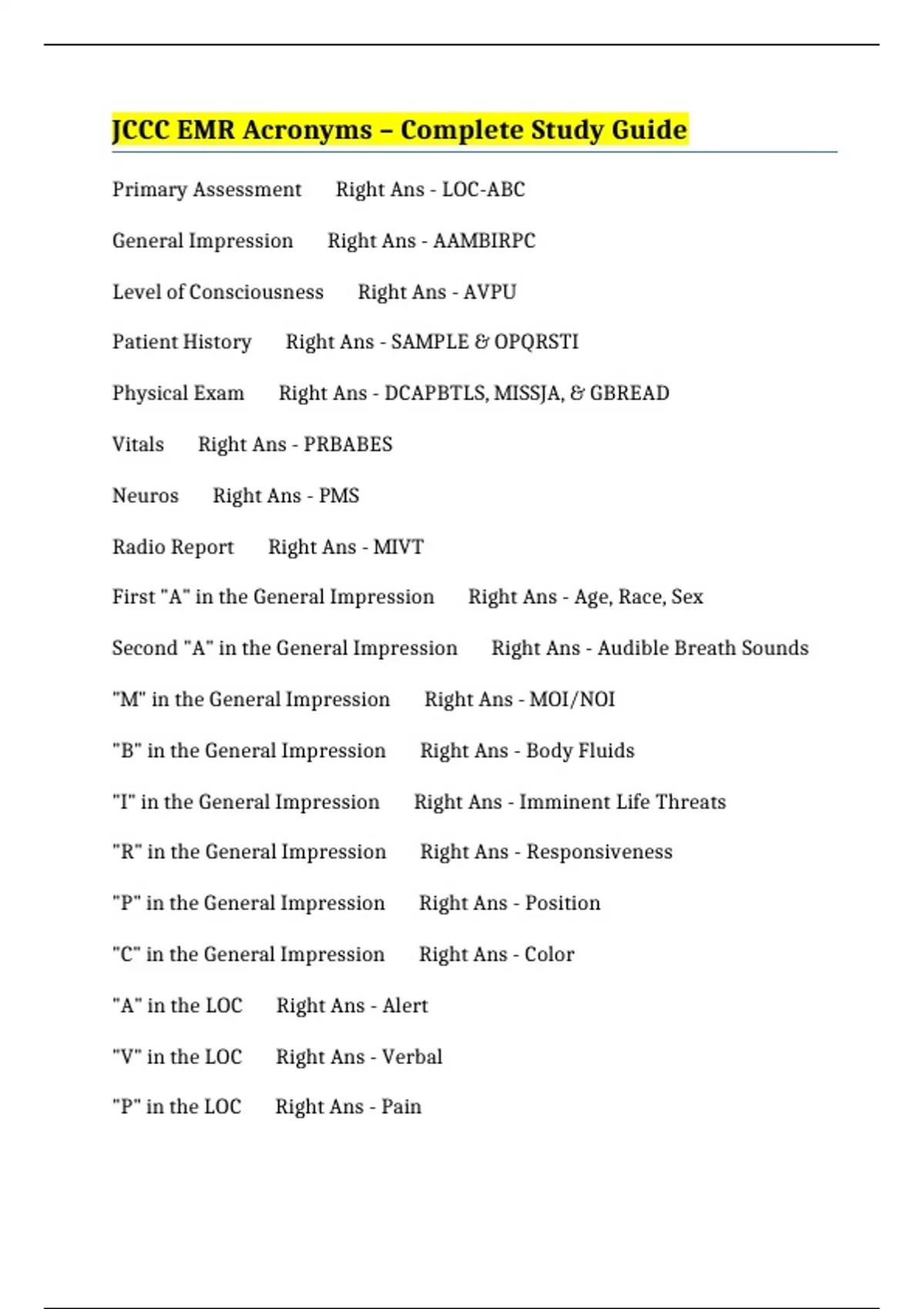 JCCC - Patient Assessment | Acronyms – Complete 100%