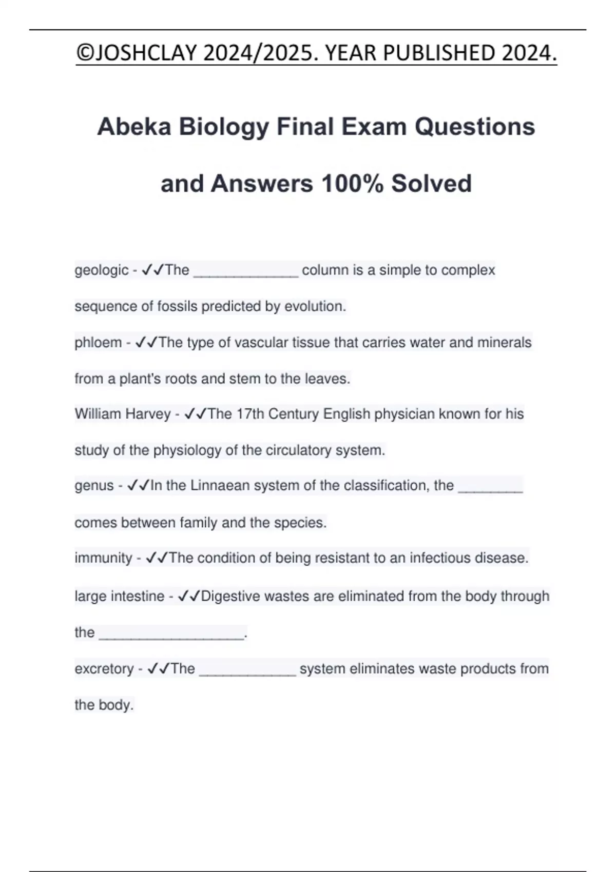 Abeka Biology Final Exam Questions and Answers 100% Solved