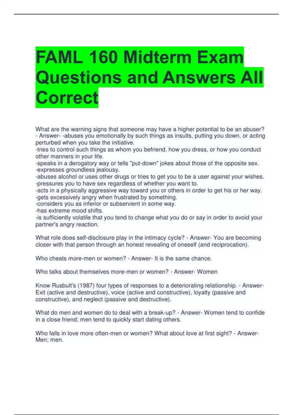BYUI FAML160 Midterm Exam Questions with All Correct Answers 2 Exam (elaborations) FAML 160 Midterm Exam Questions and Answers All Correct 3 Exam (elaborations) FAML 160 Midterm Exam Questions with Revised Answers All Correct 4 Exam (elaborations) FAML 160 FINAL EXAM QUESTIONS AND CORRECT ANSWERS (VERIFIED ANSWER) 5 Exam (elaborations) FAML 160