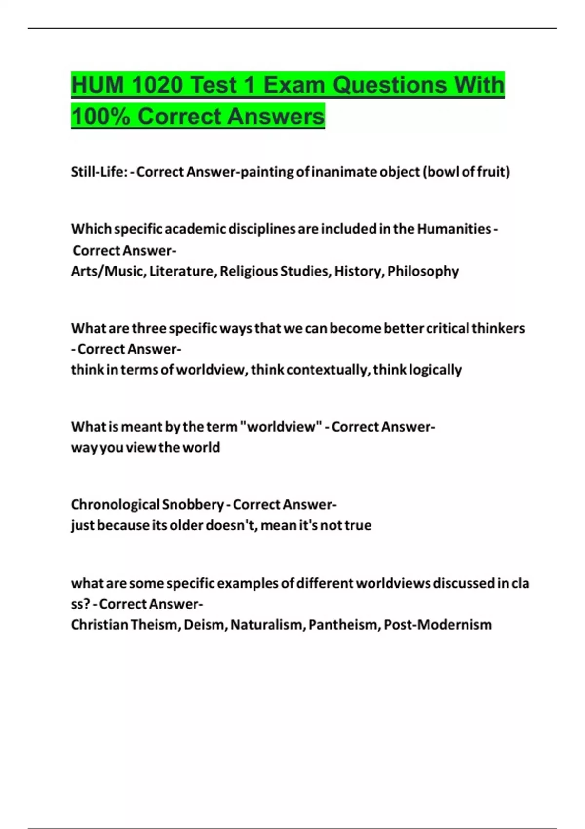 Package deal for HUM 1020 Study Guide Questions with 100% Correct Answers | Verified | Latest Update