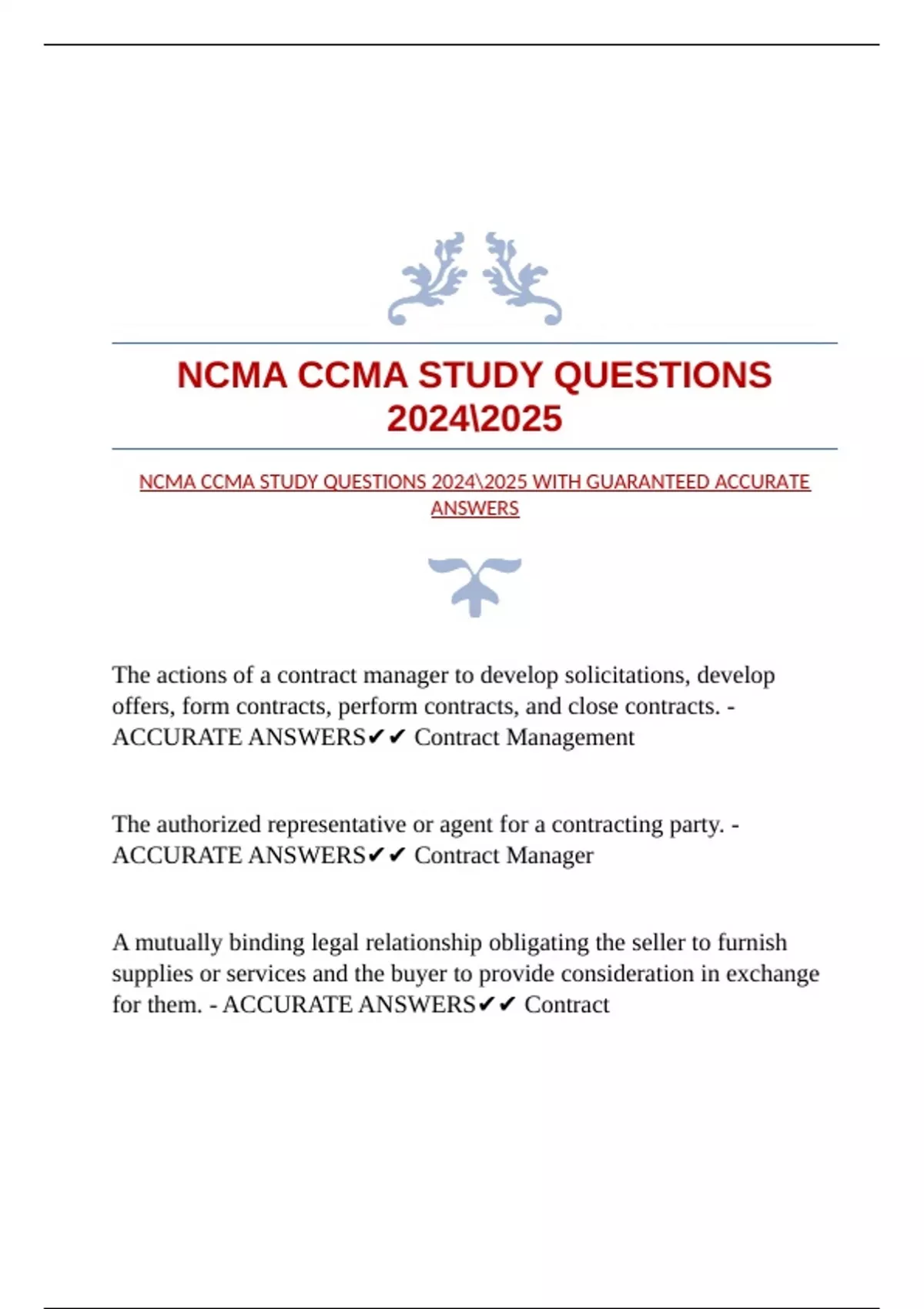 CCMA NHA EXAM STUDY SET WITH GUARANTEED ACCURATE ANSWERS NHA- CCMA EXAM QUESTIONS WITH GUARANTEED ACCURATE ANSWERS NHA CCMA EXAM WITH GUARANTEED ACCURATE ANSWERS NCMA CCMA STUDY QUESTIONS WITH GUARANTEED ACCURATE ANSWERS CCMA CERTIFICATION STUDY QUESTIONS WITH GUARANTEED ACCURATE ANSWERS |VERIFIED