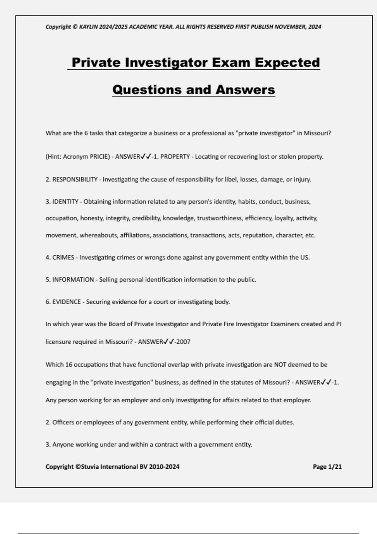 Private Investigator Bundled Exams Questions and Answers 100% Pass
