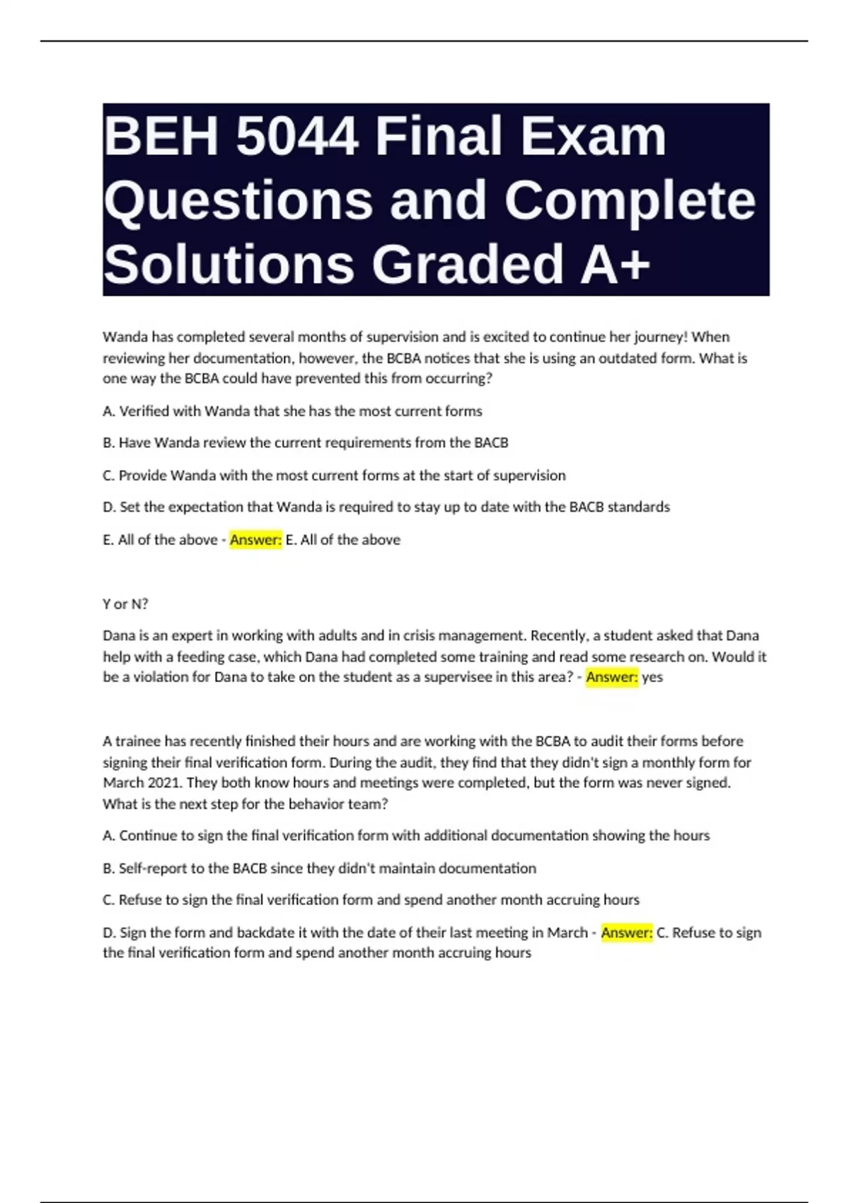 BEH 5044 Final Exam Questions and Complete Solutions Graded A+