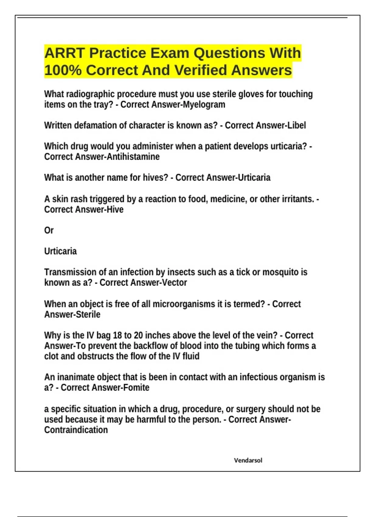 ARRT Practice Exam Questions With 100% Correct And Verified Answers ARRT Registry Exam Review With 100% Correct And Verified Answers ARRT Mock Exam With 10% Correct And Verified Answers Radiology Exam Review [ARRT] With 100% Correct And Verified Answers ARRT Patient Care Exam Review Questions With 100% Correct And Verified Answers