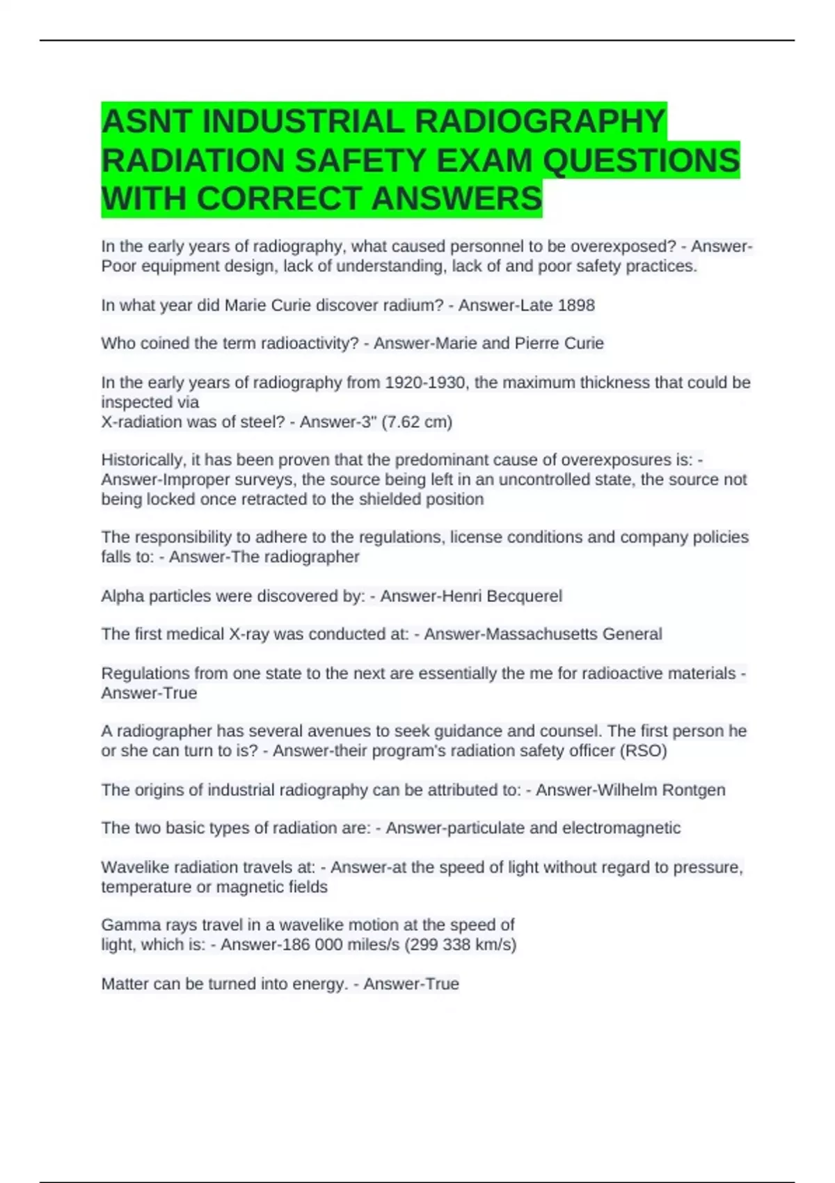 VETT 116 EXAM 1: OSHA AND RADIATION SAFETY QUESTIONS WITH CORRECT ANSWERS 2 Exam (elaborations) TITLE 17 RADIATION SAFETY EXAM QUESTIONS WITH COMPLETE ANSWERS 3 Exam (elaborations) SCDA RADIATION SAFETY EXAM QUESTIONS AND ANSWERS 4 Exam (elaborations) SCDA RADIATION SAFETY EXAM QUESTIONS AND ANSWERS 2024 5 Exam (elaborations) RDA WRITTEN EXAM -