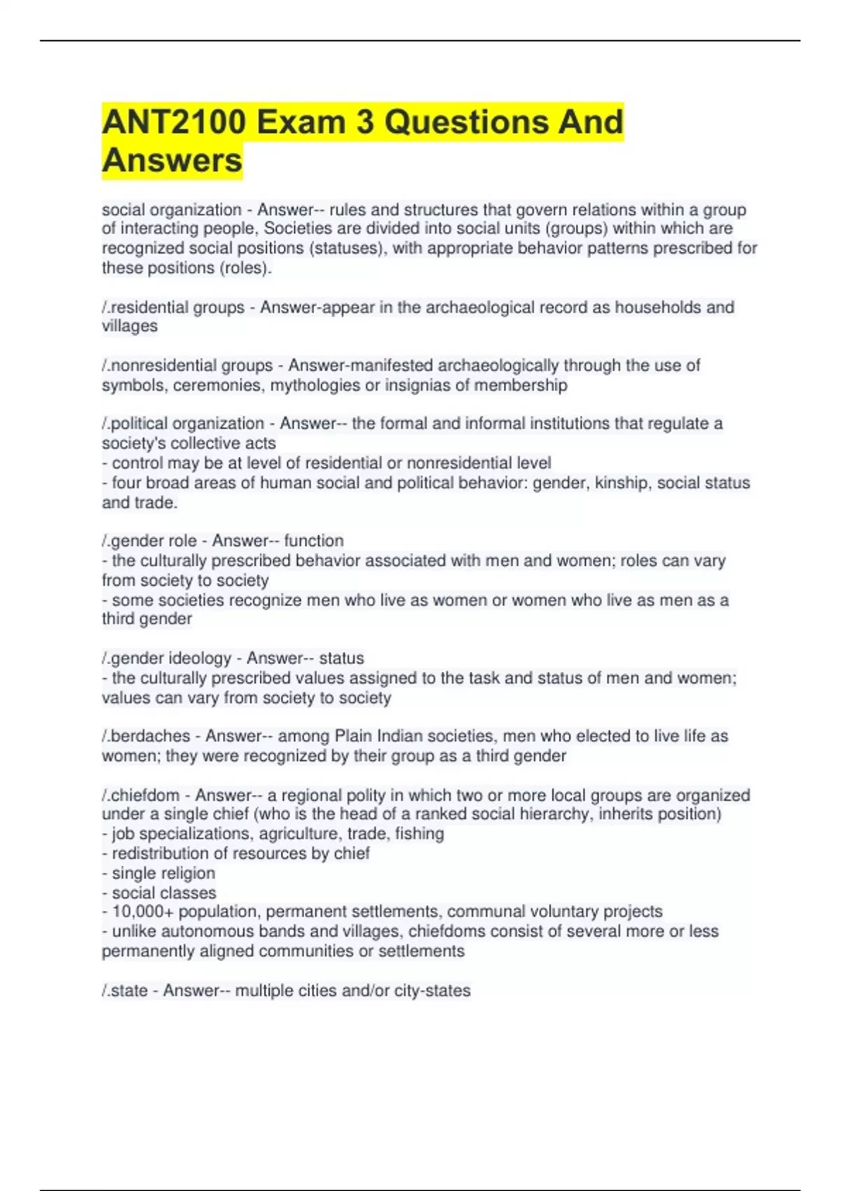Exam (elaborations) ANT 2100 EXAM 2 QUESTIONS WITH 100% PASS 2 Exam (elaborations) ANT 2100 Final Exam Questions With Detailed Answers 3 Exam (elaborations) ANT 2100 Final Exam Questions With Certified Answers 4 Exam (elaborations) ANT 2100 Quiz #1 with correct Answers 5 Exam (elaborations) ANT 2100 Midterm – FSU Exam Questions and Answers 6