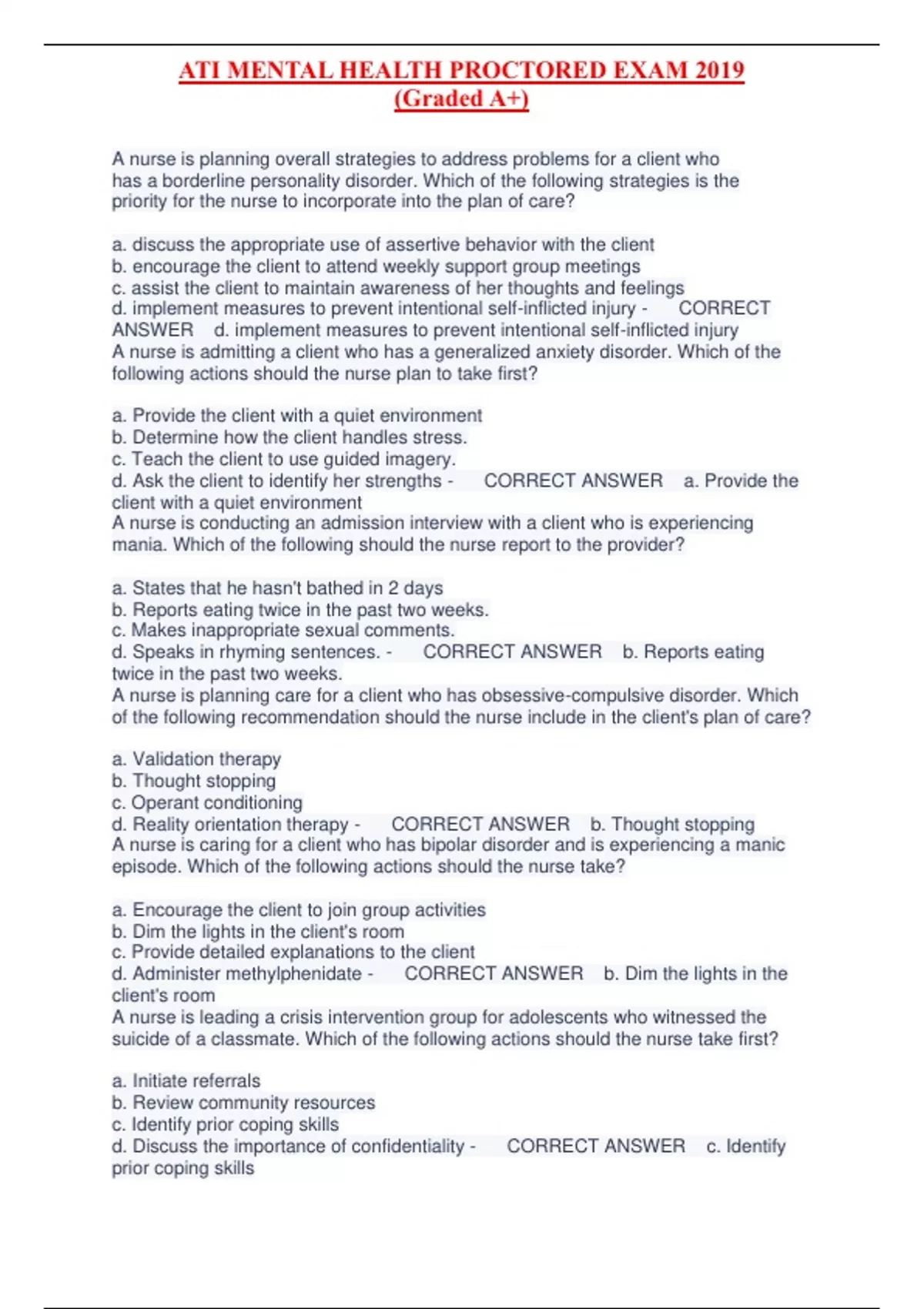 THIS VALUE PACK IS A COMINATION OF MENTAL HEALTH EXAMS LIKE: =ATI MENTAL HEALTH =PN MENTAL HEALTH =NGN =ONLINE PRACTICE